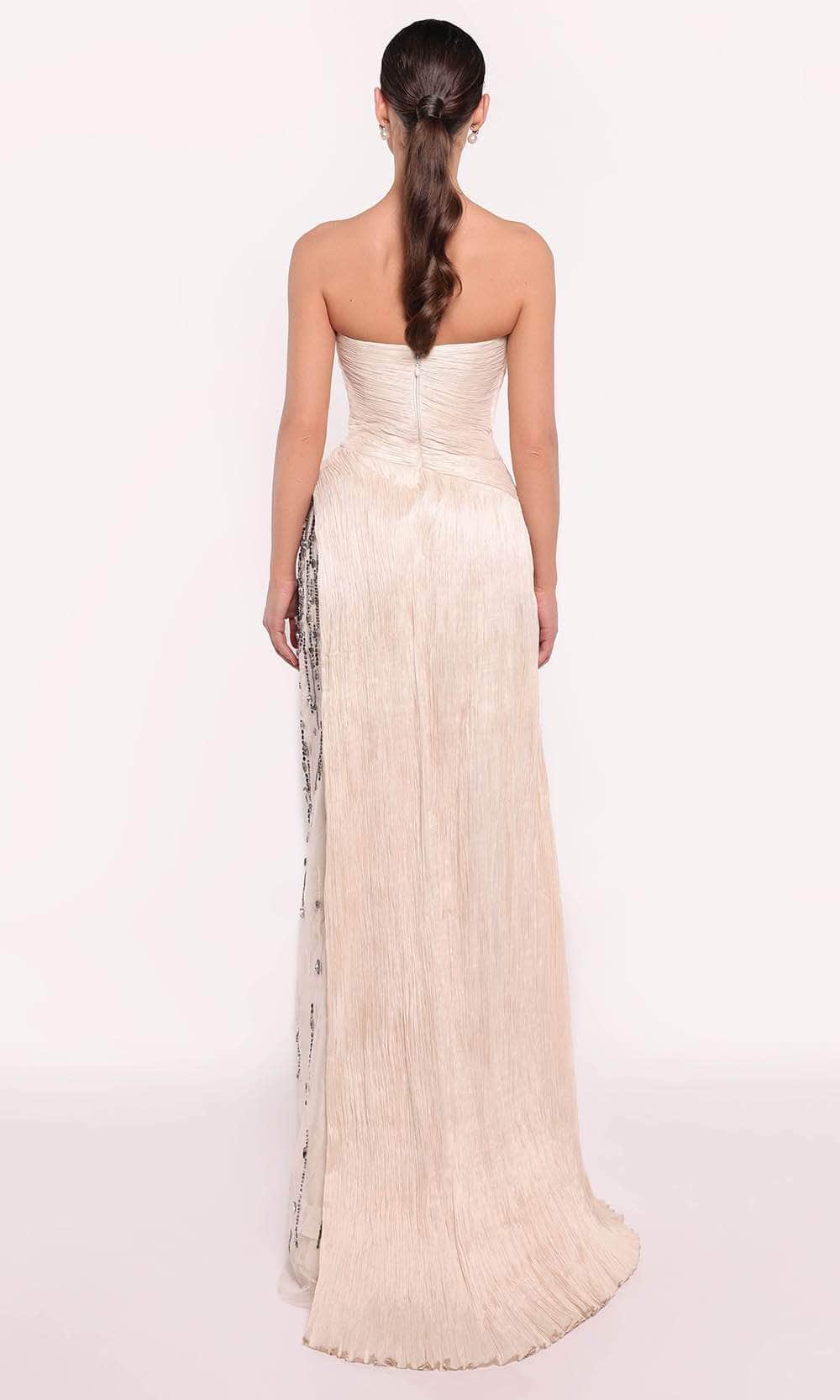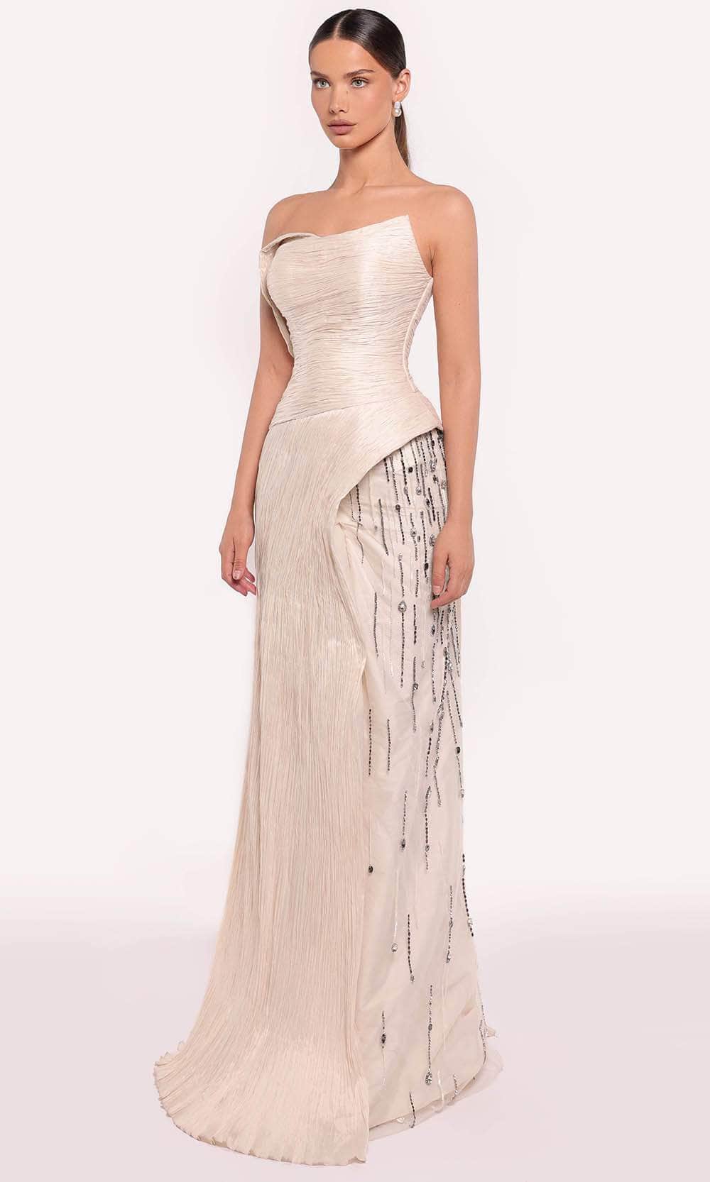 | Details: | Strapless, Shirred Structured Bodice, Peplum Design, Beaded Overlay, Sweep Train |