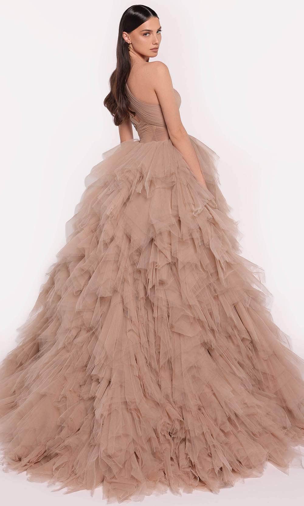 Elevate your evening with this exquisite creation from Tarik Ediz 98826. This exquisite evening dress, crafted from luxurious shirred tulle, is a testament to meticulous craftsmanship. Its tailored lines sculpt your silhouette, while the sleeveless bodice and one-shoulder neckline create a captivating allure. The cut-in shoulder and fitted bodice, adorned with a side beaded panel, add a touch of sophistication. The multi-tiered skirt, forming a ballgown silhouette and featuring a sweeping train, complements the dress's overall elegance. Step into the spotlight with this breathtaking Tarik Ediz 98826 creation. Model is wearing the Champagne color.