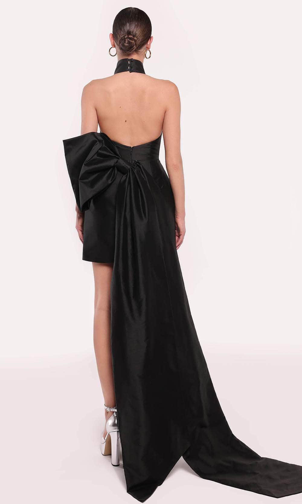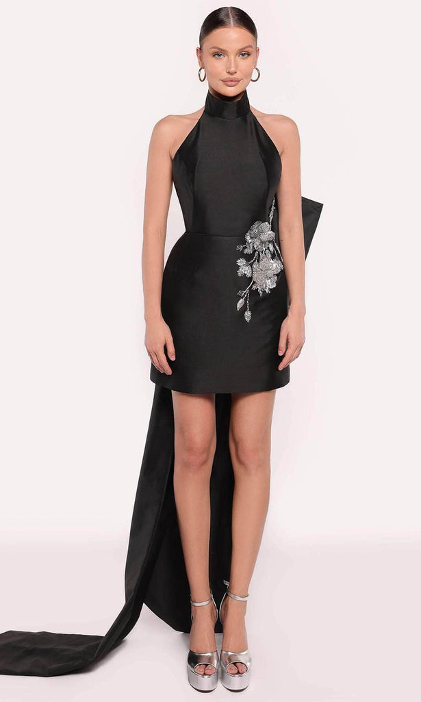 Lavish in timeless sophistication with this luxurious Tarik Ediz 98827 cocktail dress, a sartorial masterpiece. Its tailored lines sculpt the feminine form with a shirred taffeta fabric, while the sleeveless, high halter neckline and fitted silhouette exude elegance. The trailing floral beadwork on one side adds a touch of glamour, complemented by the midrise back with an oversized bow and cascading sash. The sheath skirt with a short hem completes the ensemble, making it a captivating choice for formal events. This Tarik Ediz 98827 creation is a must-have for discerning individuals seeking a dress that embodies sophistication and timeless style. Model is wearing the Black color.