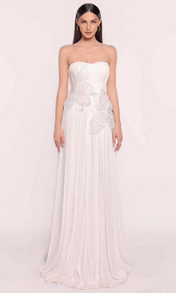 Details: Strapless, Shirred Silhouette, Floral Embroidered Detail, Pleated Skirt, Sweep Train
