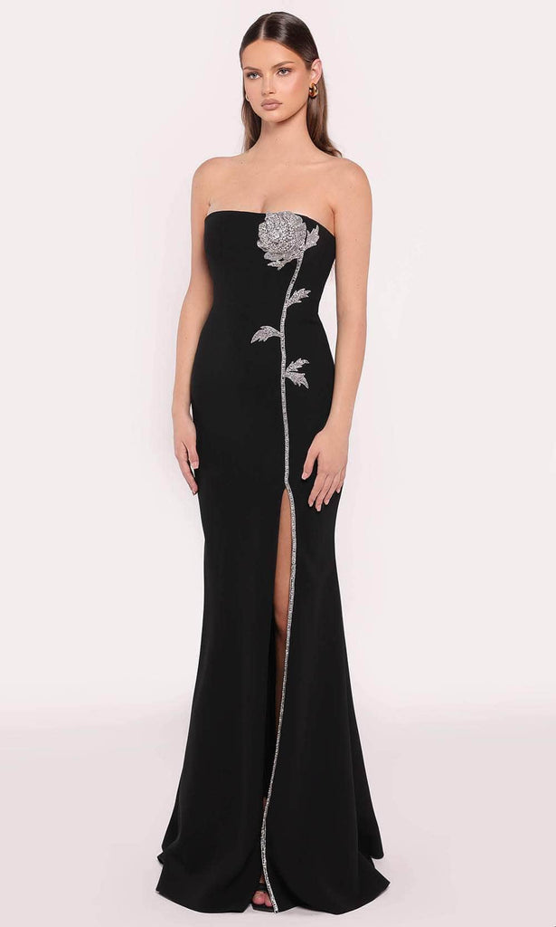 Exude confidence and charm in this effortlessly chic Tarik Ediz 98871 masterpiece. This exquisite evening dress, crafted from luxurious crepe, is a testament to meticulous craftsmanship. Its tailored lines sculpt your silhouette, while the strapless, straight-across neckline and silver beadwork in a rose motif create a captivating allure. The midrise back adds a touch of sophistication. The mermaid skirt features a high slit and a sweeping train. Be the center of attention in this exquisite Tarik Ediz 98871 creation. Model is wearing the Black color.