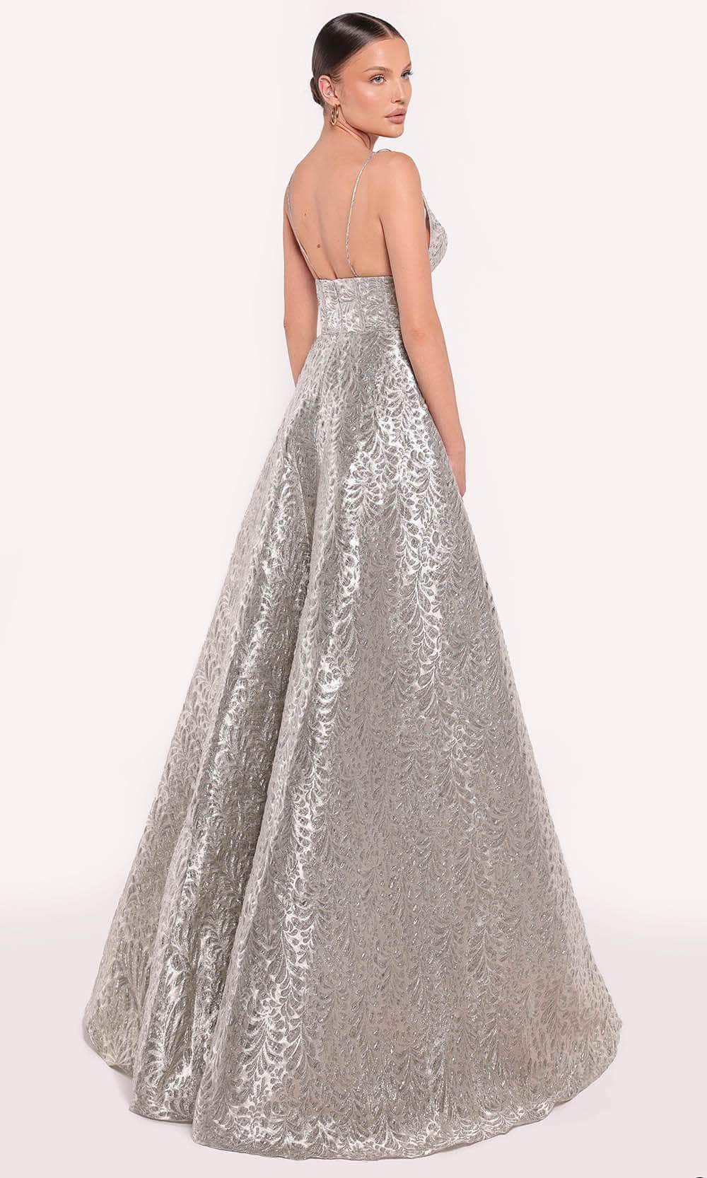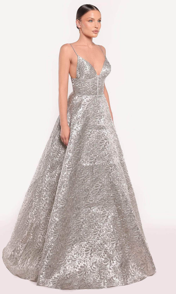 Crafted with passion and precision, the Tarik Ediz 98873 evening dress is a sartorial masterpiece. Its tailoring lines sculpt the feminine form with a luxurious embossed jacquard fabric, while the spaghetti straps and V-neckline create a striking silhouette. The corset boning on the bodice and midrise back add a touch of glamour, complemented by the A-line skirt and floor-length hem. This Tarik Ediz 98873 stunner embodies both understated luxury and bold statement-making. Model is wearing the Silver colors.