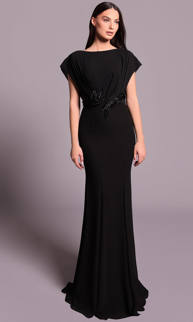 Sleek sophistication defines Tarik Ediz 99004, a crepe dress with artful draping and sculpted lines. Its bateau neckline with soft cap sleeves creates a clean, balanced upper silhouette. The bodice features lace appliques and elegant side draping, highlighting the waist with refined shaping. From there, a fitted sheath skirt flows smoothly to the floor, elongating the frame while maintaining graceful movement. Tarik Ediz 99004 showcases minimalism elevated with distinctive tailoring and understated yet impactful design elements. Model is wearing Black color.