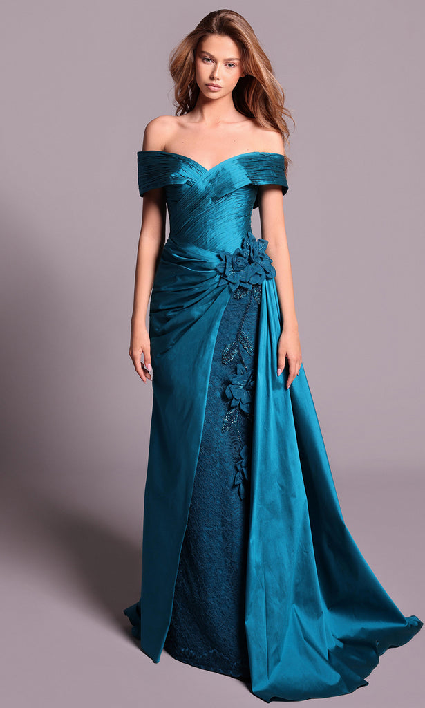 Sophistication flows through every detail of Tarik Ediz 99040, a dress created to showcase graceful movement and modern femininity. Its off-shoulder fold over neckline frames the collarbones while transitioning into a structured ruched bodice that sculpts the waist. A softly draped overlay cascades from the waistline, enhanced by floral appliques and lace-embroidered panel that add depth without overwhelming the silhouette. The smooth sheath base subtly elongates the figure, while the sweep train finishes the design with understated drama. Tarik Ediz 99040 reflects contemporary elegance for those seeking captivating simplicity with refined artistry. Models are wearing Vanilla, and Turquoise colors.