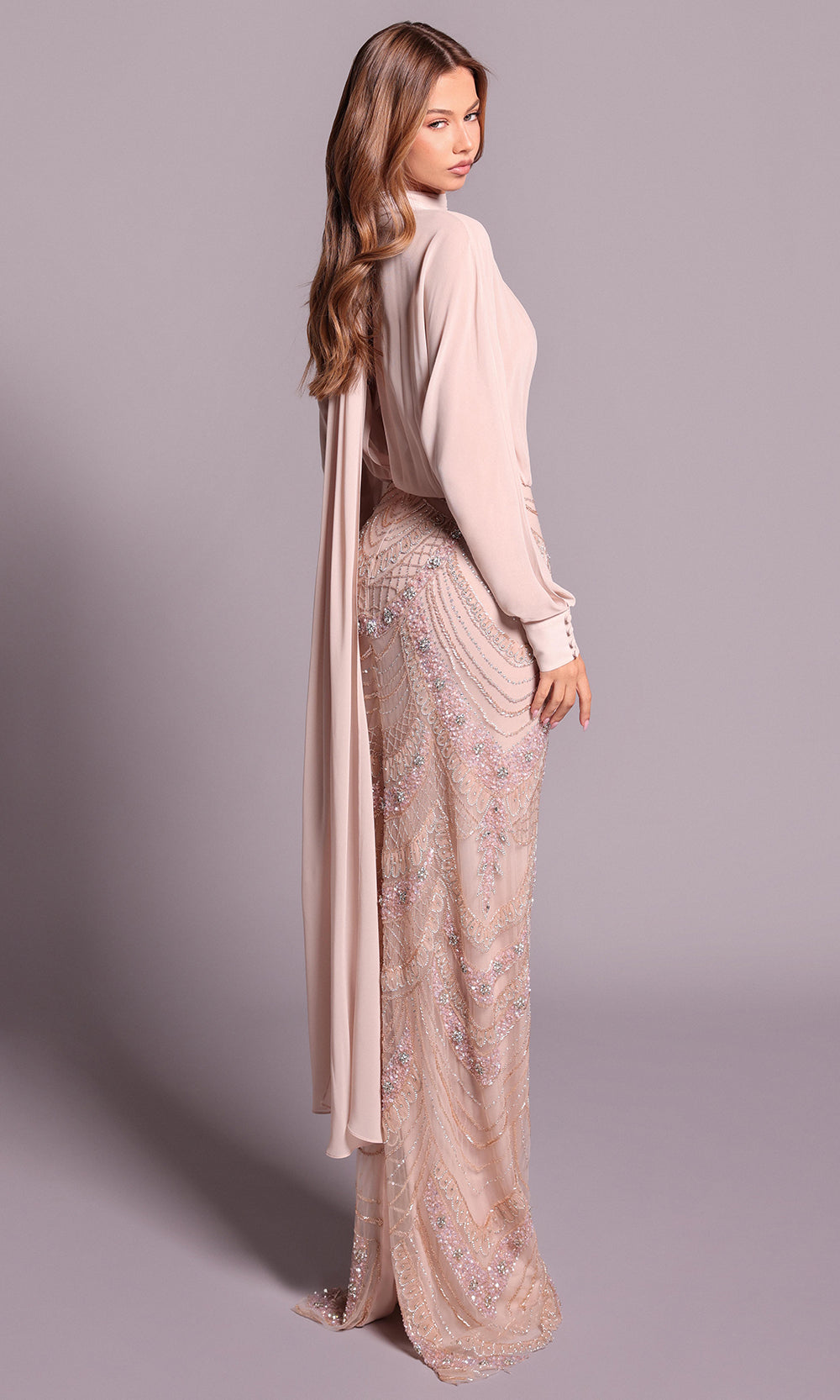 Presence is redefined by Tarik Ediz 99050, a gown created to draw attention with quiet strength and detailed artistry. Its softly draped blouson bodice sits above a high neckline, lending a composed and stately air without overpowering the look. Below, a fitted column skirt gleams with intricate beaded designs arranged to elongate and move fluidly as light passes across the surface. Long sleeves frame the design with an understated elegance, while the chiffon drape at the back completes the look. Tarik Ediz 99050 offers a captivating balance of fluid movement and precision detailing that feels timeless and memorable.