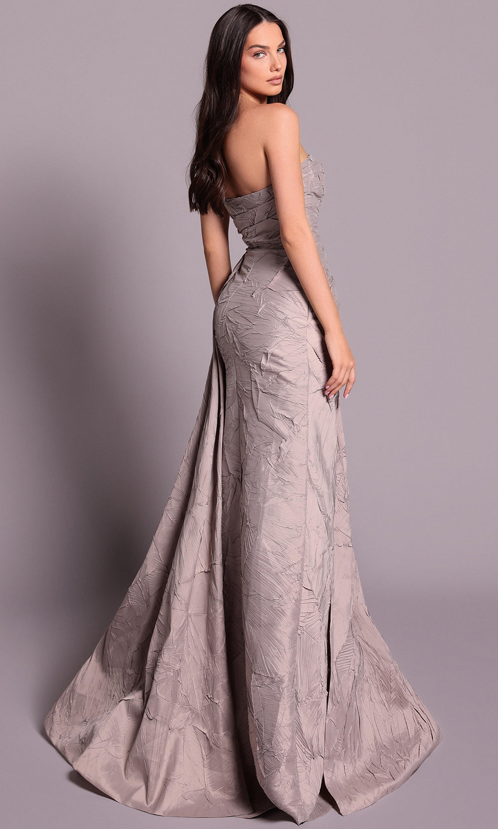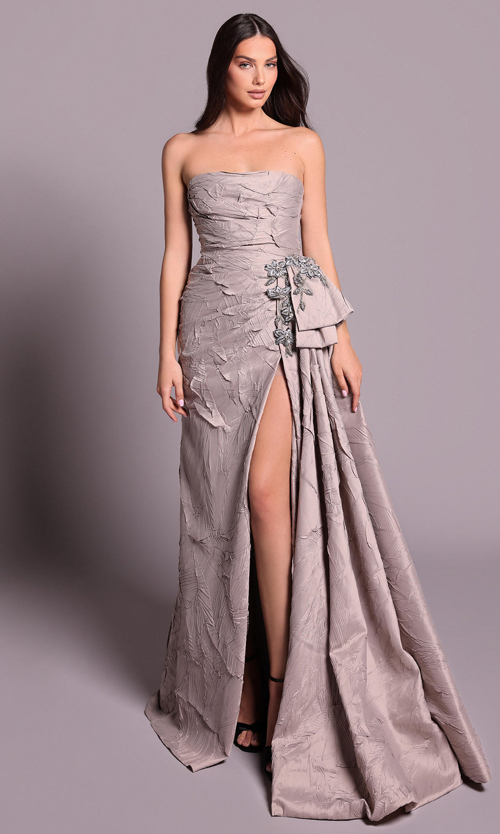 Sculpted artistry is revealed in the Tarik Ediz 99105, showcasing exquisite texture and thoughtful draping. A strapless straight neckline enhances the shoulders, while the bodice is softly ruched to emphasize natural curves. The waist features a distinctive bow and floral beaded applique that introduces an element of architectural beauty. A long sheath skirt with a daring slit and draped side sash flows effortlessly, balancing structure with fluidity. Invest in striking visual impact with the Tarik Ediz 99105, an inspired creation with enduring style.
