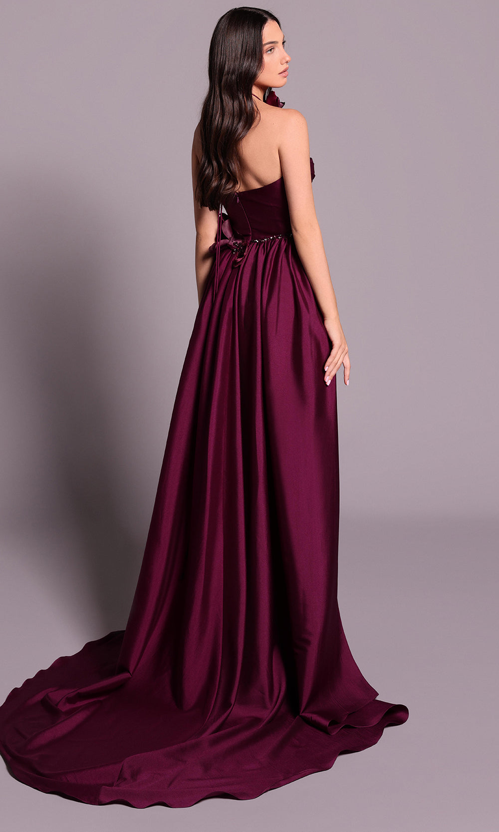 Every detail of this Tarik Ediz 99106 dress speaks of impeccable artistry and timeless charm. It highlights the beauty of structured draping balanced by 3D floral embellishments at the choker and waist. The strapless bodice with its straight-across neckline exudes charm, while ruched accents sculpt and flatter the figure beautifully. The fitted sheath base meets a cascading overskirt that glides into a soft train, bringing gentle motion as you walk. Tarik Ediz 99106 brings elegance and romance to any special occasion. Model is wearing Cranberry Juice color.