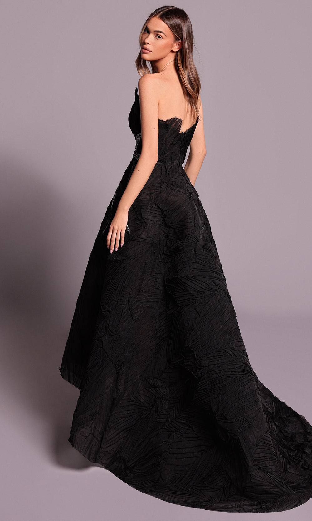Stepping into graceful fashion moments becomes effortless with Tarik Ediz 99117. This dress features a strapless scalloped neckline that highlights the collarbone beautifully, while the structured bodice provides flattering support. A natural waistline is accentuated by beaded detail, leading into a sweeping A-line skirt that flows elegantly to the floor. Its textured finish gives the entire silhouette a refined depth that adds a distinctive character. Choosing Tarik Ediz 99117 offers a statement look that celebrates sophisticated design and striking presence. Model is wearing Black color.