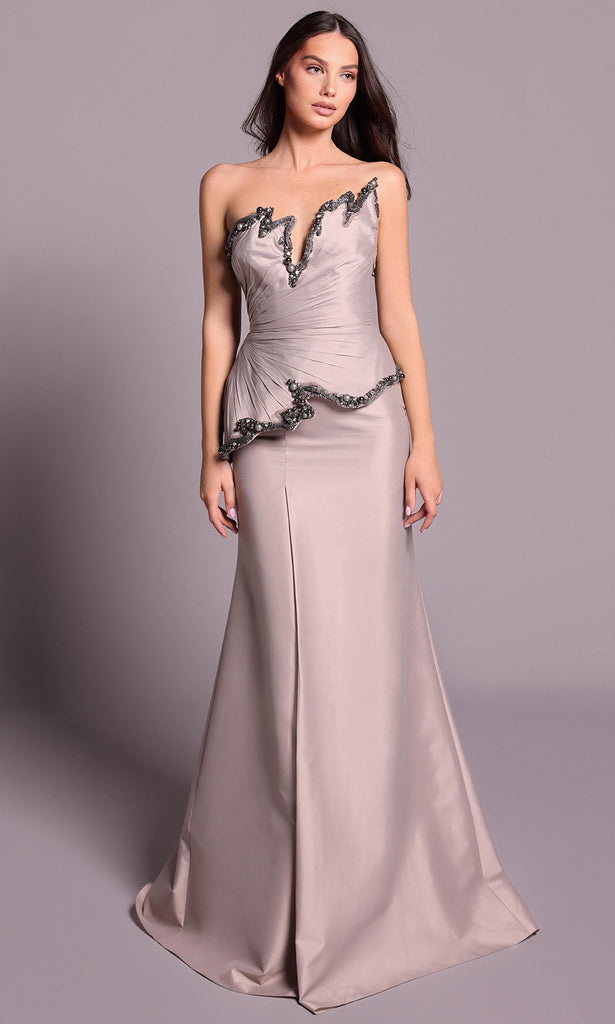A graceful sense of poise defines the Tarik Ediz 99119, making it ideal for a polished evening look. Its strapless cut and asymmetric neckline sparkles with delicate bead trim, while the ruched bodice flatters and texture the silhouette. A soft peplum detail flows into a floor length sheath skirt, creating a look that is sleek yet distinctive. Perfect for occasions where understated beauty matters, the Tarik Ediz 99119 blends simplicity with just the right amount of charm.