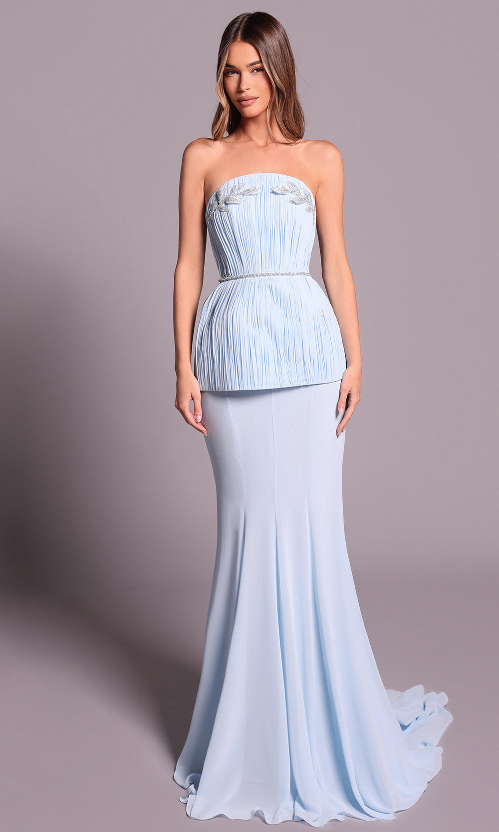 Elegance takes a structured yet graceful form in the Tarik Ediz 99123. The strapless bodice features a beautiful straight across neckline, thin belt and sparkling beaded embellishments. A delicate ruching flows seamlessly into a soft peplum detail, adding dimension and flattering the waistline. Its smooth fitted sheath skirt continues into a sweep train, creating a sophisticated yet fluid movement with each step. Designed for those who appreciate timeless silhouettes with a touch of modern flair, the Tarik Ediz 99123 captures attention with its artful tailoring and subtle statement-making appeal. Model is wearing Blue Aura color.