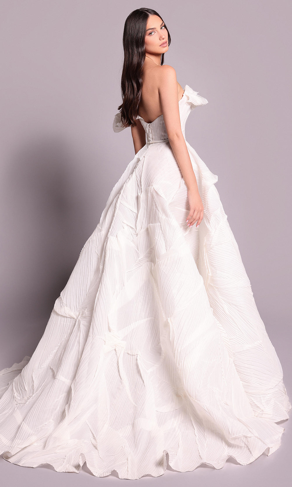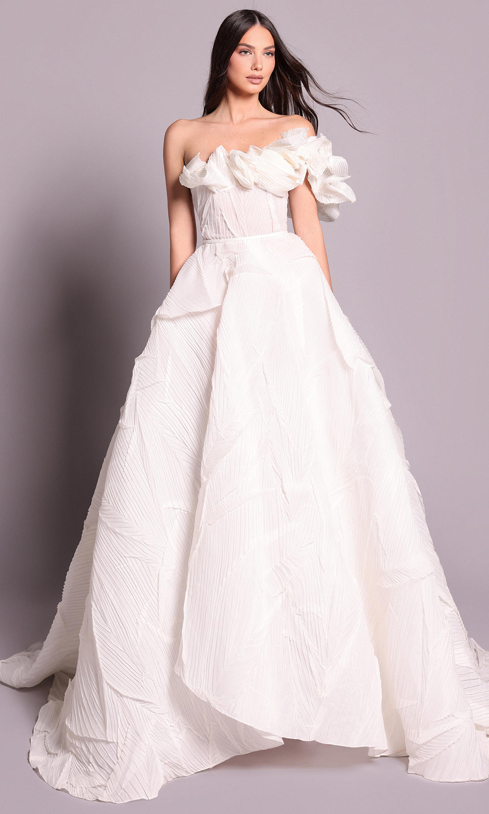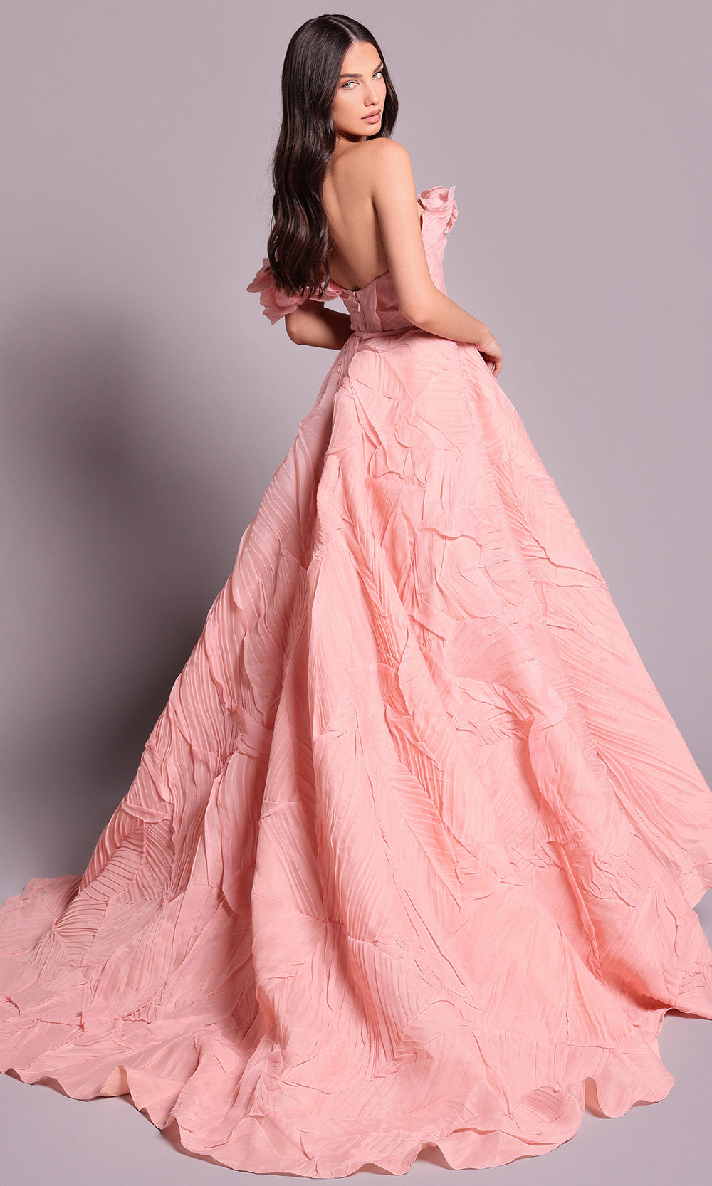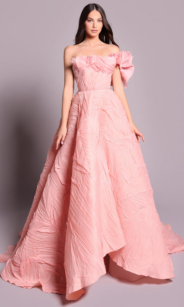 An air of sophistication surrounds the Tarik Ediz 99125, a crushed organza gown meant for memorable evenings. The off shoulder neckline highlights the collarbone with a statement ruffle, while a defined waistline flows into a full ballgown skirt. Its dramatic volume and textured finish create an unforgettable look that feels both fresh and classic. When your goal is to leave a lasting impression, the Tarik Ediz 99125 offers a perfect balance of modern style and timeless appeal. Models are wearing Ivory, and Ice Pink colors.