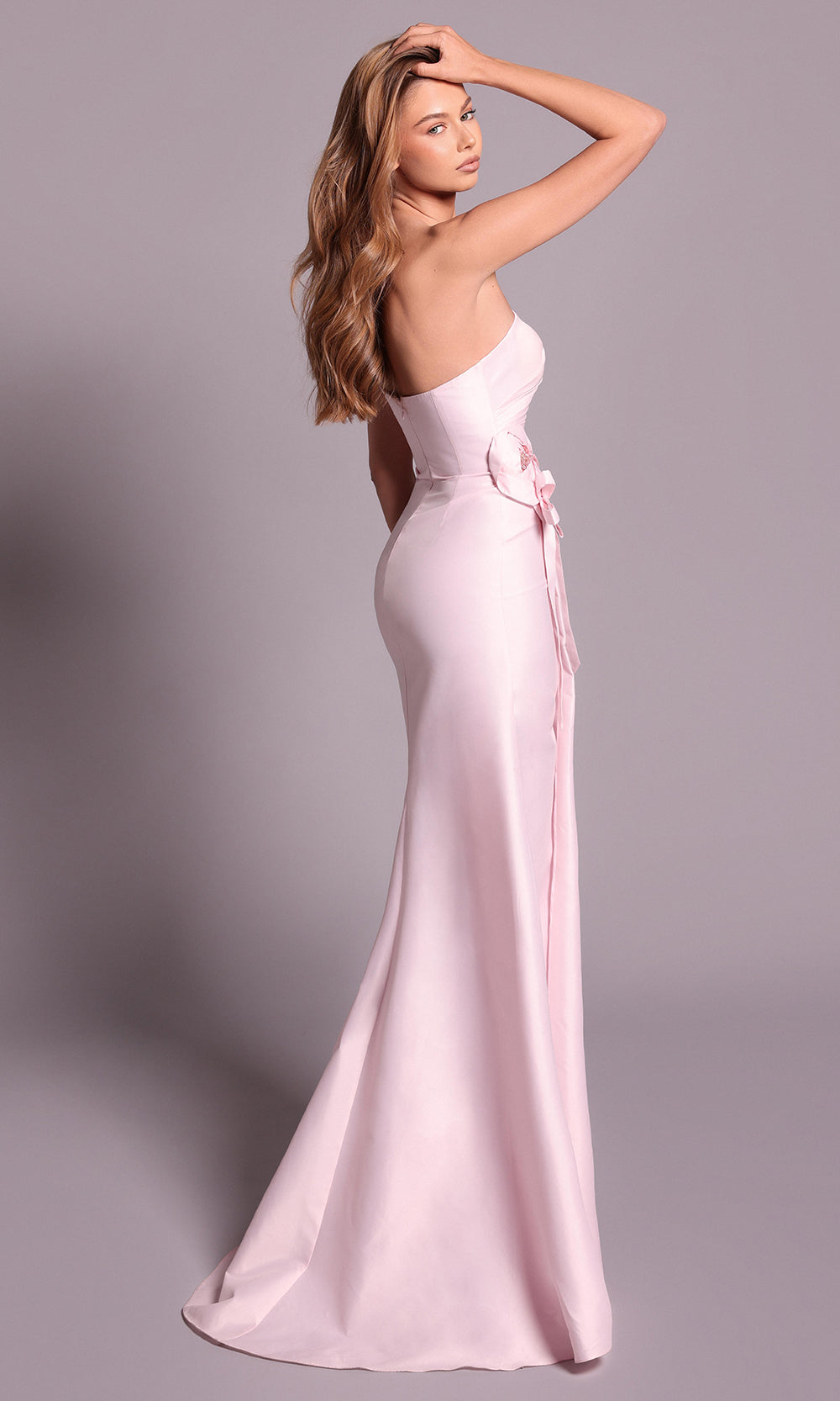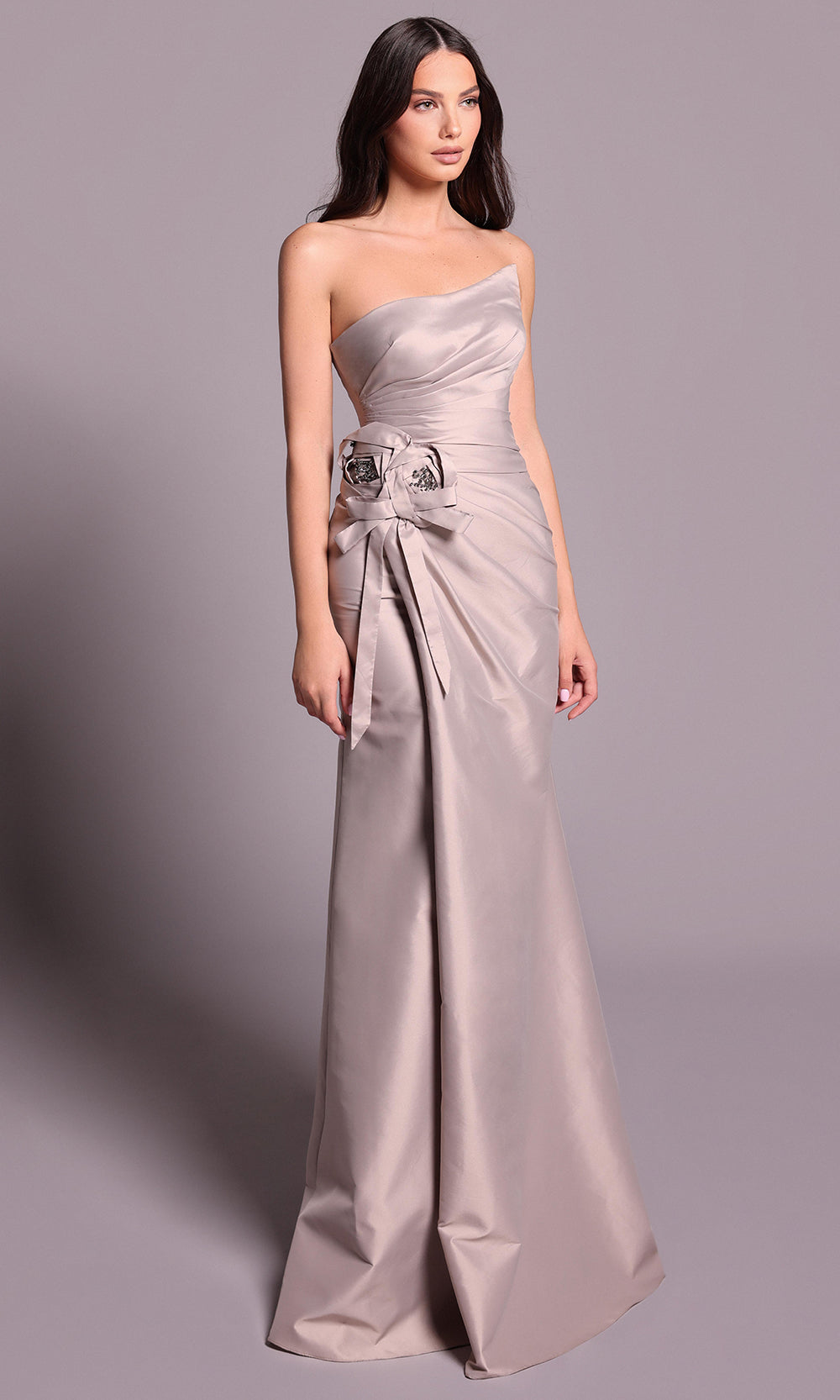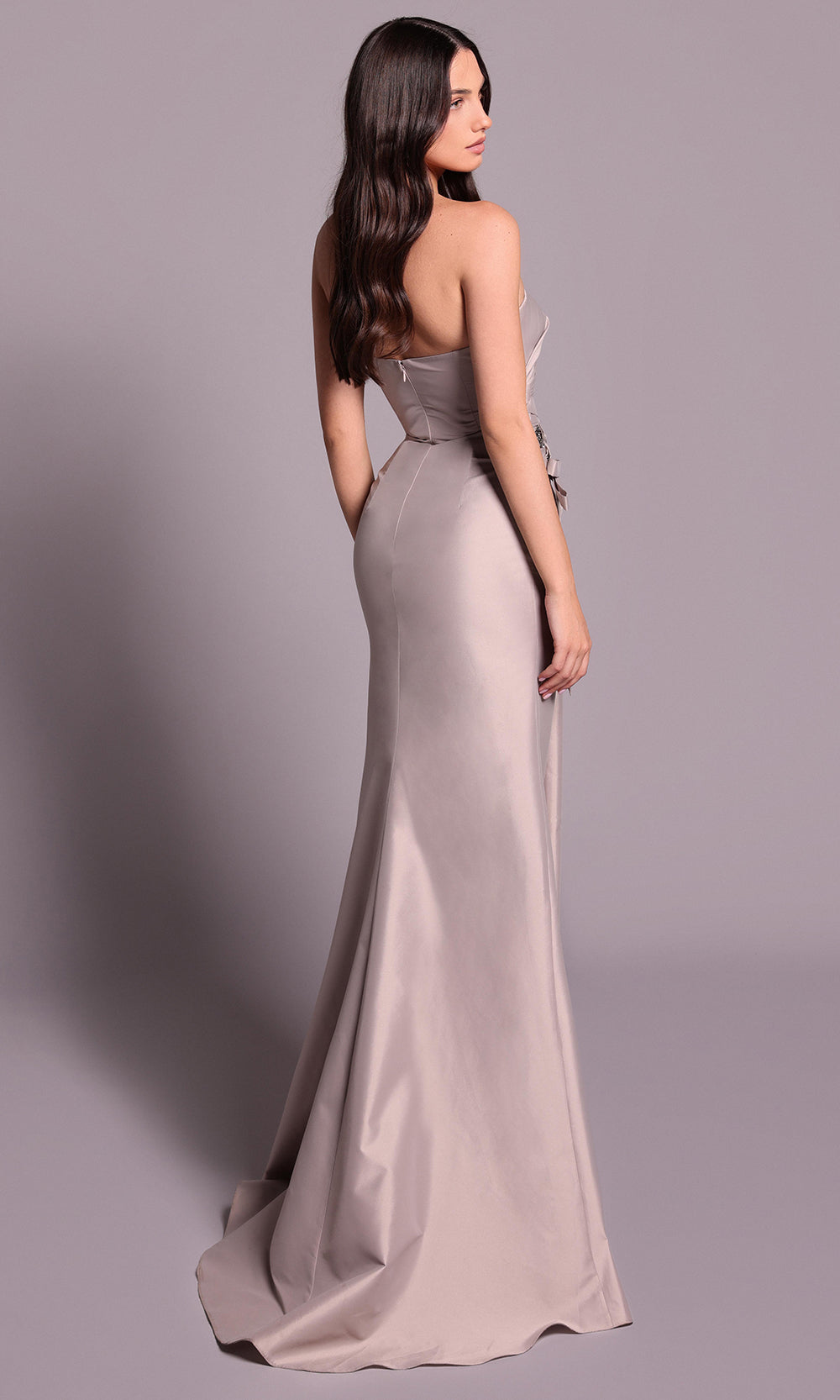 Achieve an effortlessly stunning look wearing the Tarik Ediz 99126 sheath dress. The fitted ruched bodice gently wraps the figure, while a floral accent at the waist adds a sculptural element that feels artful without overwhelming the design. Defined by a strapless design, asymmetric neckline, and daring open back, it showcases modern allure. Tarik Ediz 99126 transforms classic evening style into something fresh and captivating through its unexpected draping and modern floral highlight. Models are wearing Mink, and Ice Pink colors.