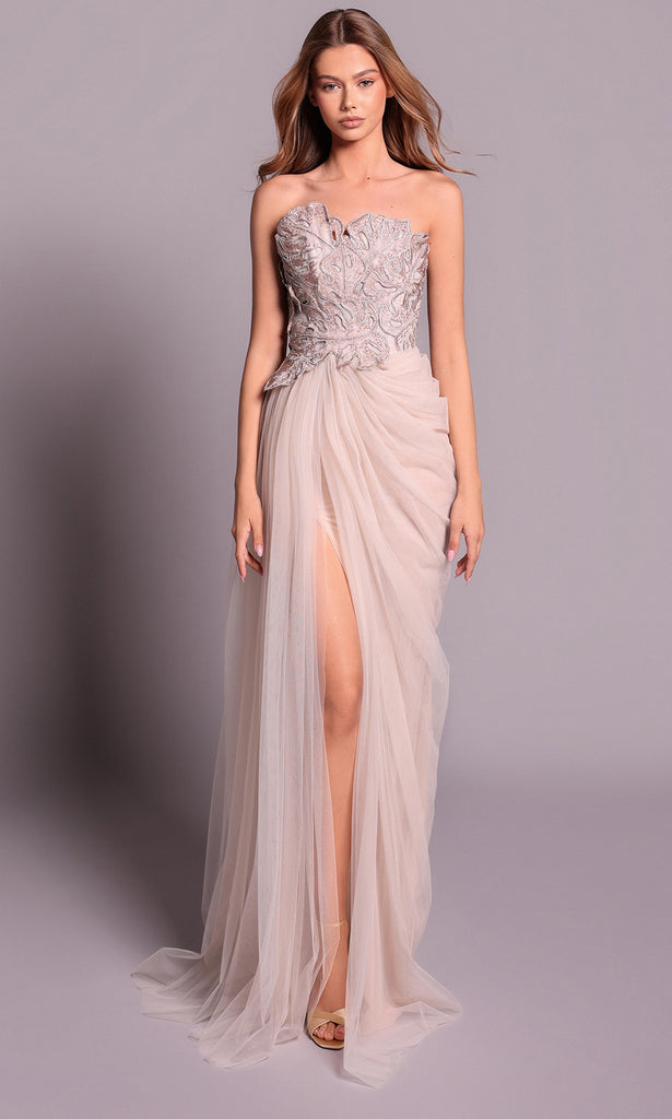 All eyes will turn your way the moment you step out in this Tarik Ediz 99133 long dress. The strapless bodice unveils a sweetheart neckline with beading and lace applique that adds interest without overpowering the silhouette. A subtle side slit brings both movement and an understated hint of allure. The overall look balances a softly gathered sheath skirt with a structured, sculpted top. Tarik Ediz 99133 embraces timeless femininity while presenting a fresh approach to modern formalwear.