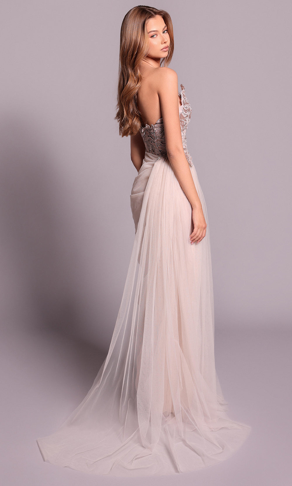 | Details: | Lace Applique, Beading, Strapless, Draped Skirt, Slit, Open Back, Sweep Train |
