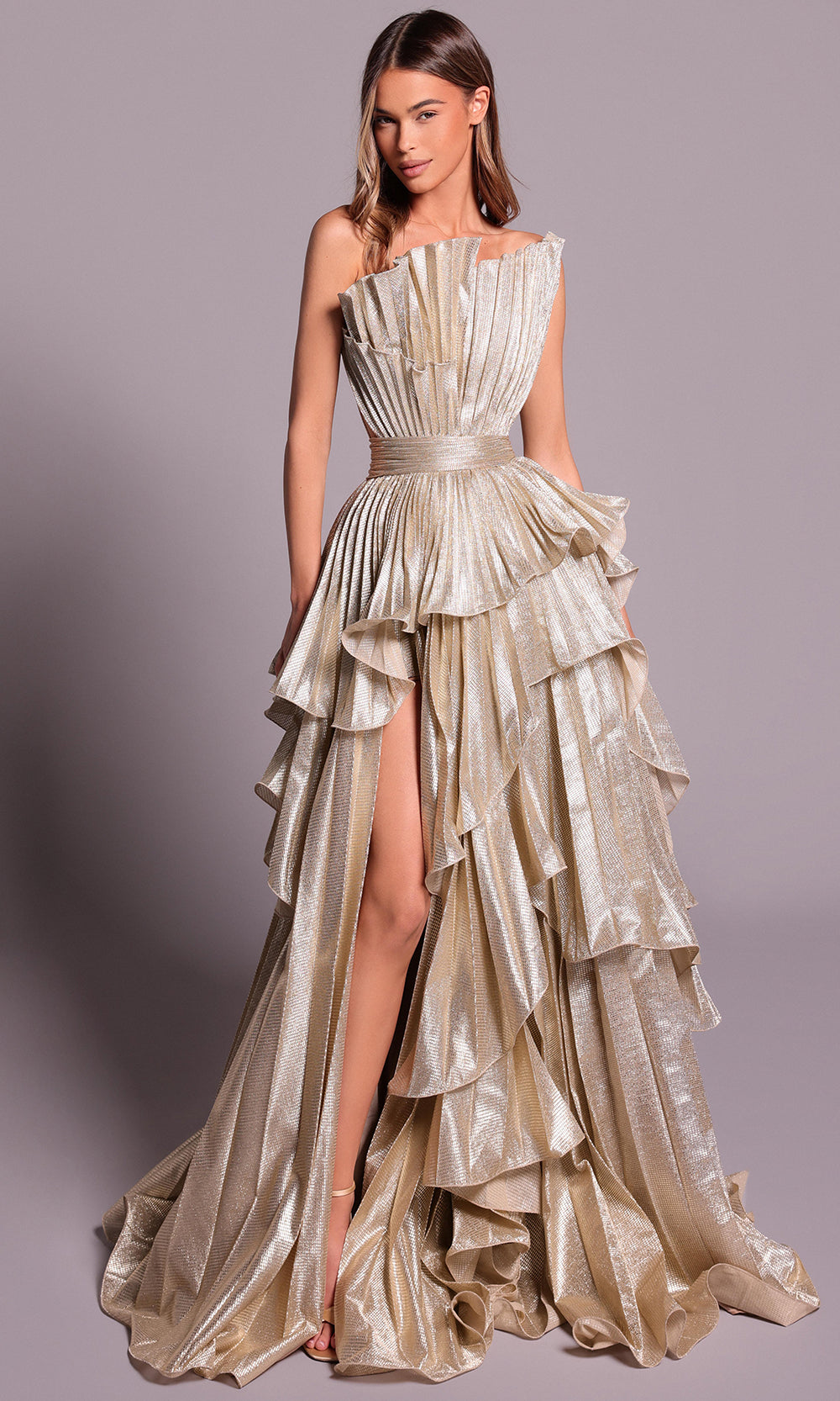 Statement making elegance shines in the Tarik Ediz 99148, perfect for those who want fashion with impact. The asymmetric neckline and strapless cut highlights the shoulders, while sharp pleats give structure to the bodice. A defined wide waistband adds balance before unfolding into a flowing layered A-line skirt with a dramatic side slit. Its silky foil fabric catches the light beautifully, ensuring attention at every turn. For an unforgettable evening look, the Tarik Ediz 99148 offers striking style with refined detail. Model is wearing Gold color.