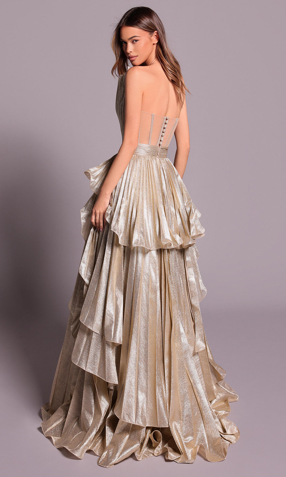 | Details: | Strapless, Pleated Bodice, Wide Waistband, High Slit, Illusion Back, Layered Skirt |