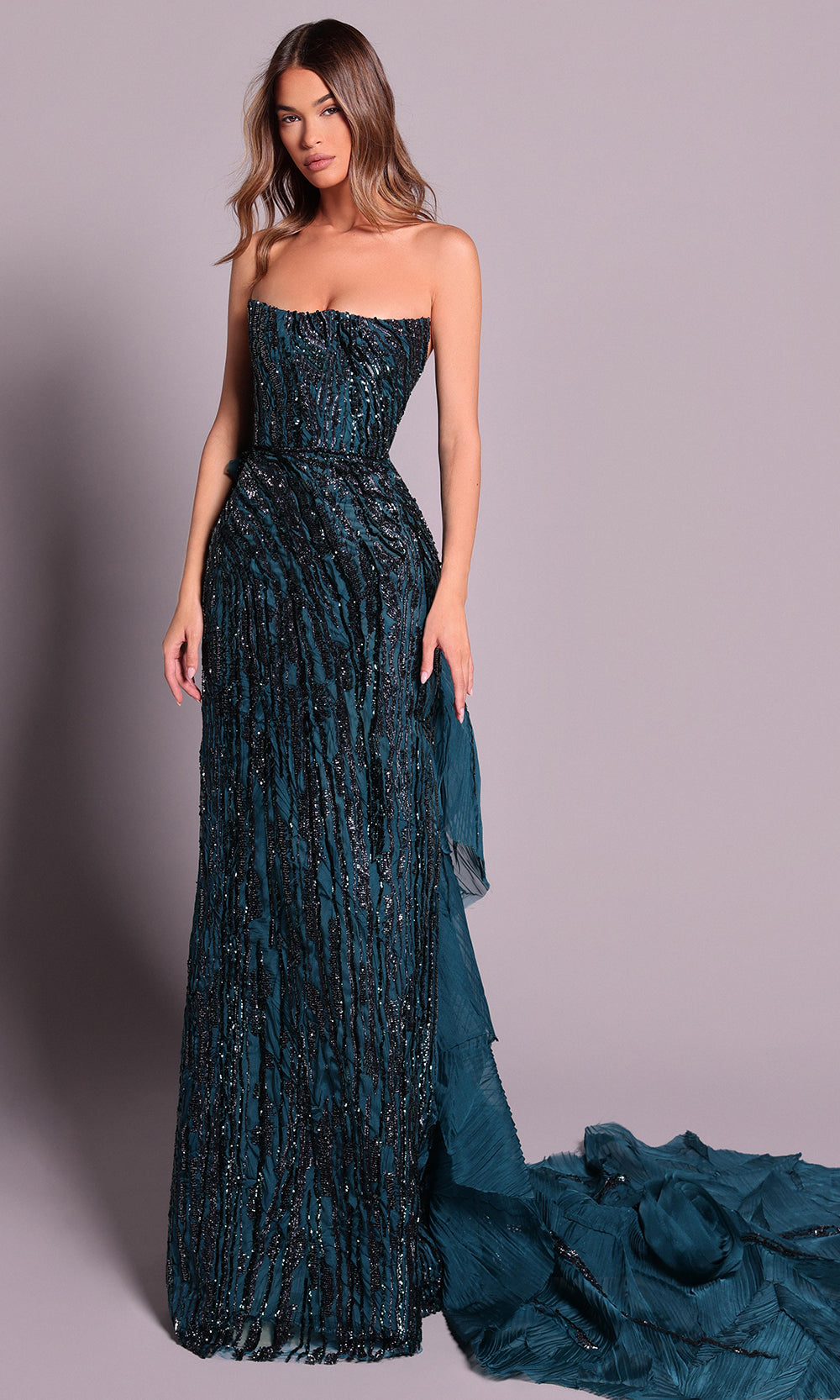 A moment of quiet glamour unfolds the instant the Tarik Ediz 99153 enters the room, radiating poise from every angle. This strapless dress balances structure and movement, offering a refined yet dramatic impression. The fitted embellished bodice catches the light beautifully, while the strapless straight-across neckline frames the shoulders with delicate precision. The overskirt with 3D floral accent flows elegantly behind, adding volume and grace to the sleek sheath base. The Tarik Ediz 99153 transforms classic beauty into modern sophistication, perfect for grand occasions where presence matters most. Model is wearing Atlantic Blue color.