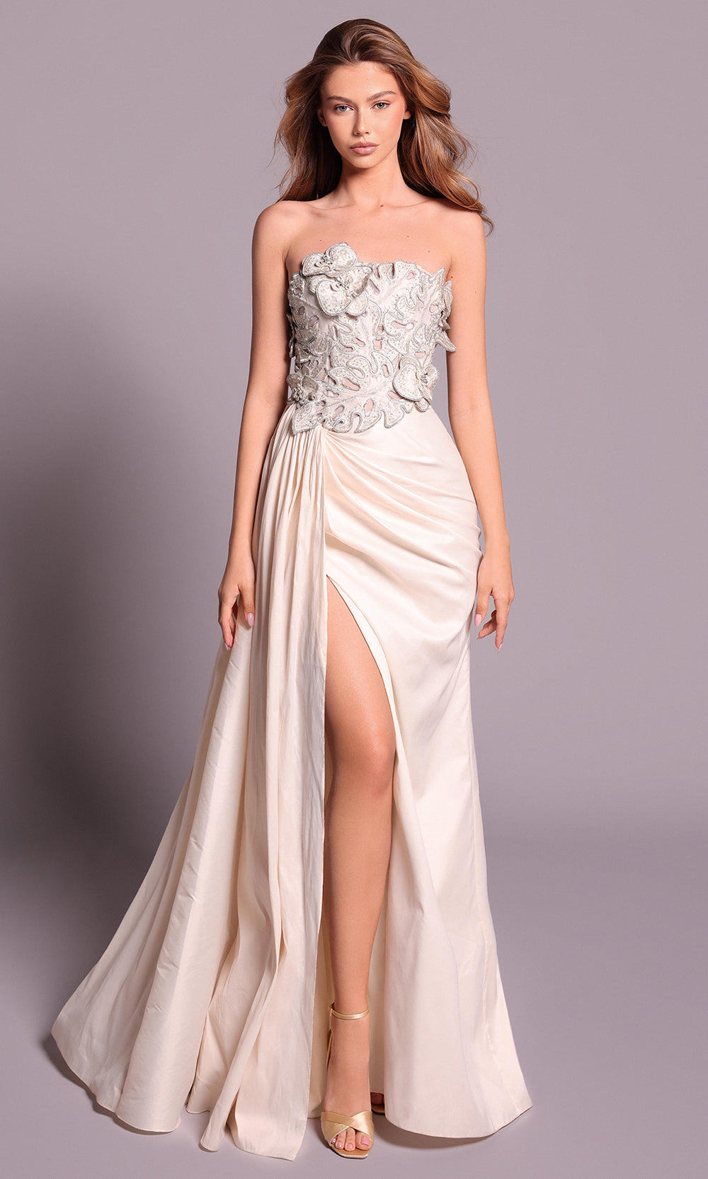 Evening style feels elevated with the Tarik Ediz 99154, a strapless design meant for impactful entrances. The straight-across neckline frames the dress beautifully, while intricate beadwork and artistic embroidery enrich the bodice with captivating texture. The elongated sheath skirt parts into a tasteful slit, complemented by a draped sash that softens the look with effortless charm. Choose the Tarik Ediz 99154 when you want a polished look that merges creativity and refined appeal in one unforgettable design.