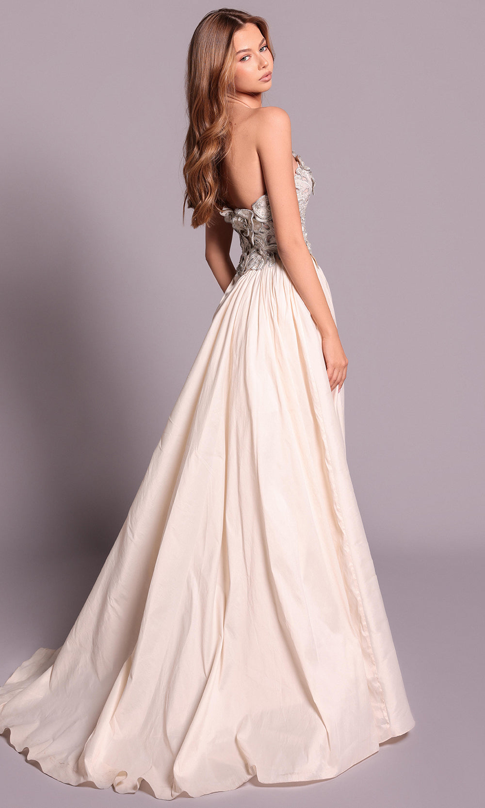 | Details: | Beaded, Embroidered Applique, Strapless, Draped Side Sash, High Slit, Sweep Train |