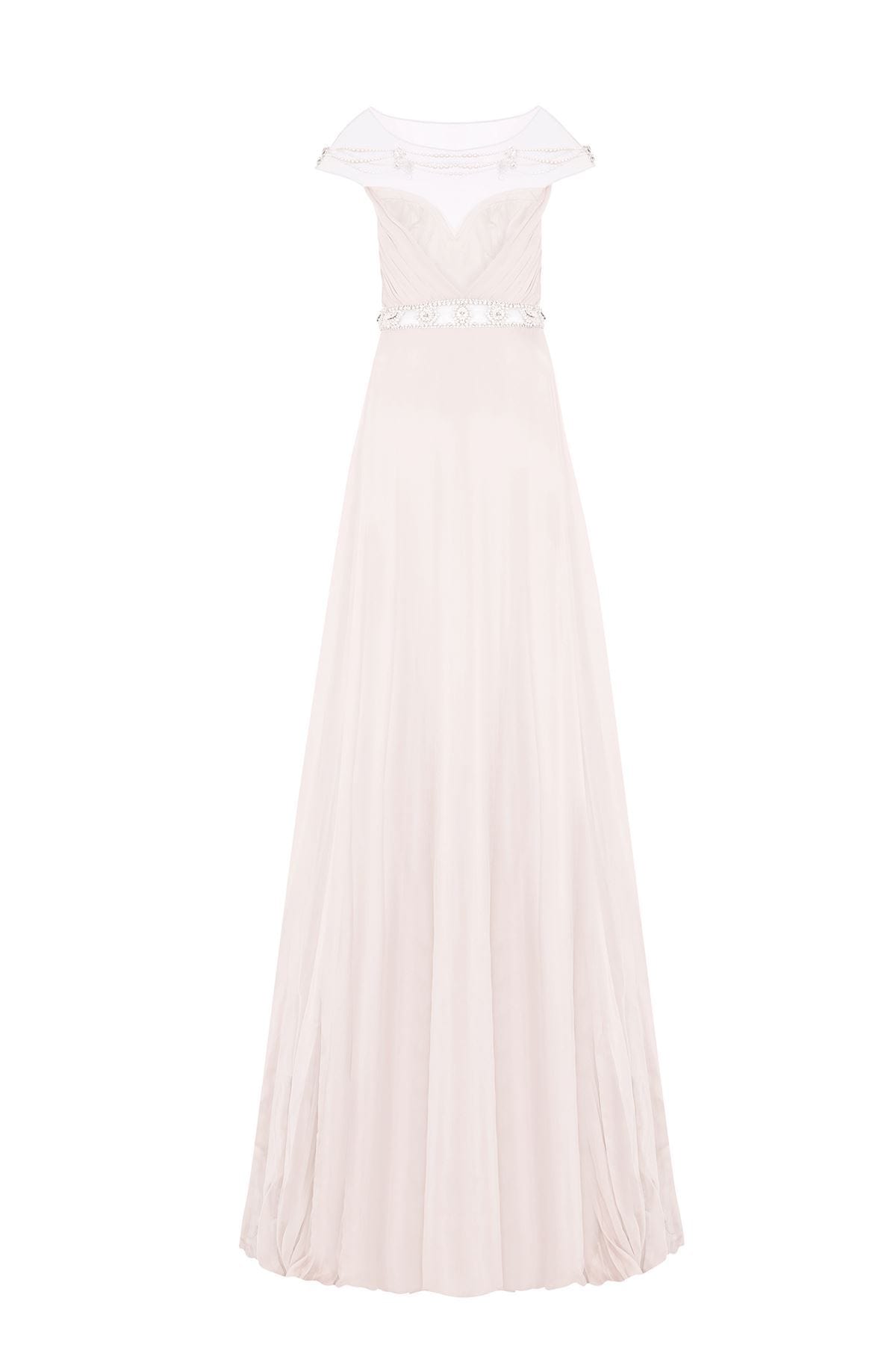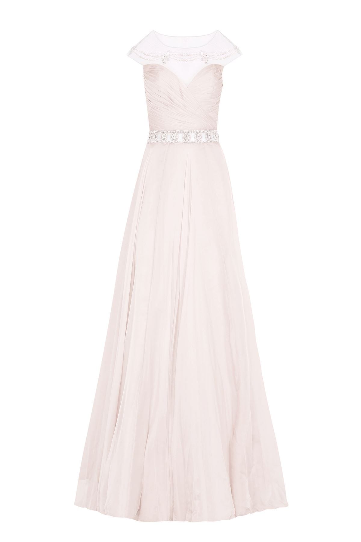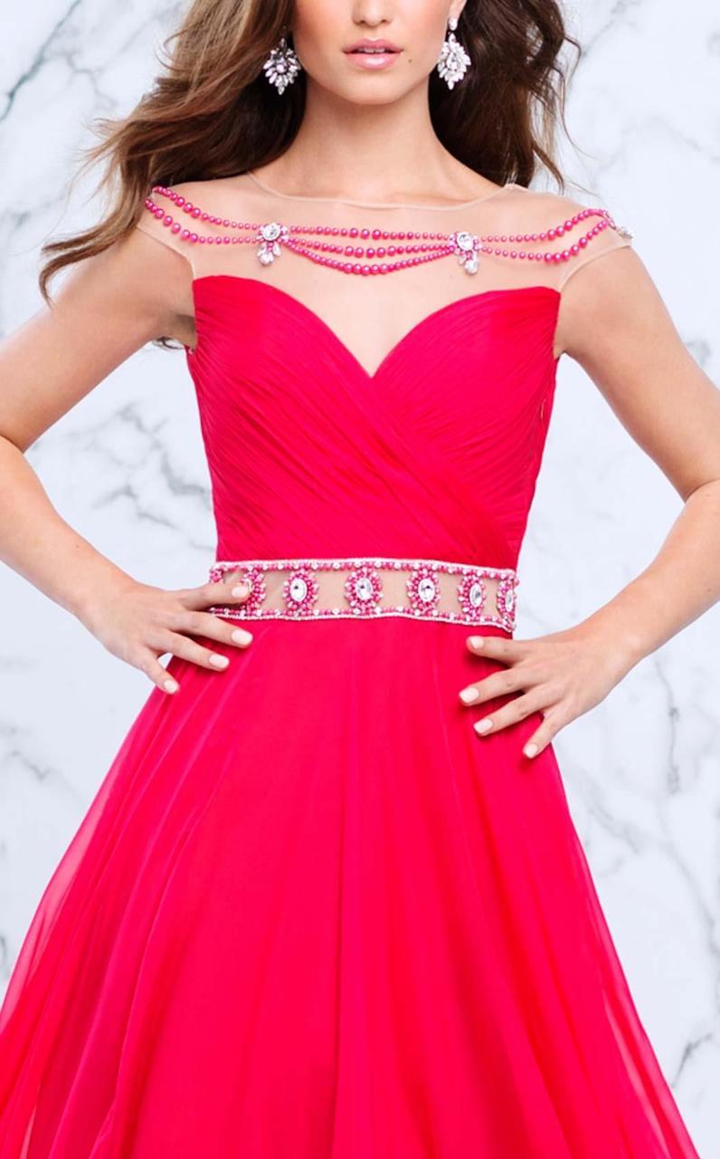 | Details: | Cap sleeves, Sheer fabric, Pearl accent bodice and waistband, Jewel details, Sweetheart lining, Ruched bodice, A-line skirt, V-shaped back |