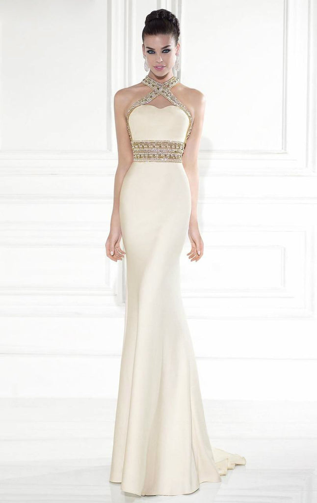 Be the showstopper at your next evening event with distinct details throughout this entire evening gown by Tarik Ediz 92530. The crisscross Model is wearing Cream color. halter strap style gown is completely embellished with lavish beadworks, framing the svelte sweetheart bodice, fully adorning the back and defining the sleek waistline. The skirt cascades down with light flared shape and finishes with a full length hem. This gown has a subtle train at back. You will be all set for an unforgettable evening with so much admiration from the crowd for wearing this beautiful and dazzling Tarik Ediz creation! Model is wearing the Cream color.
