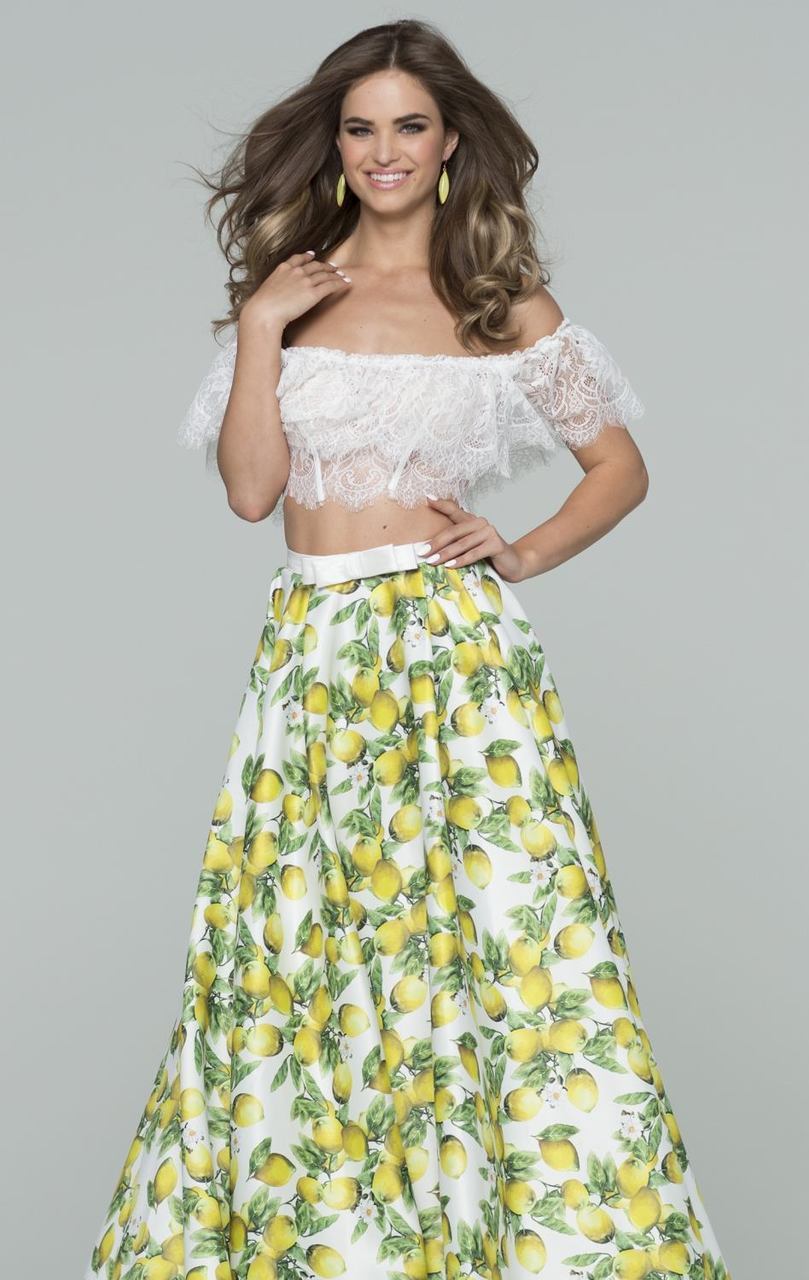 Highlight your artful esprit in this chic, off-the-shoulder two piece gown by Tarik Ediz 50074. The illusion, lacy bodice boasts a scallop-edged ruffle at the neckline and a bikini lining beneath the fitted bust. Corset stays and scalloped edging trim the sheer, cropped midriff, and a satiny waistband with a double bow debuts the contrasting skirt. Soft gathers flare to a fluttering full-length. This Tarik Ediz creation is simply spectacular.