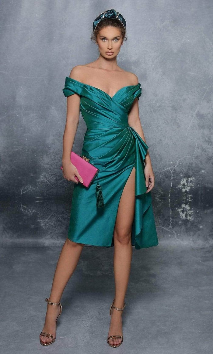 So sexy, this Taffeta dress brings the appealing qualities of a chic classy style to cocktail event. The bodice is luxuriously crafted with pleats while brandishing a plunging off-shoulder neckline and a V-shaped back. The slim A-line skirt showcases asymmetric pleats and ruffle drape that reveals the thigh-high leg and slit. Model is wearing the Emerald color.