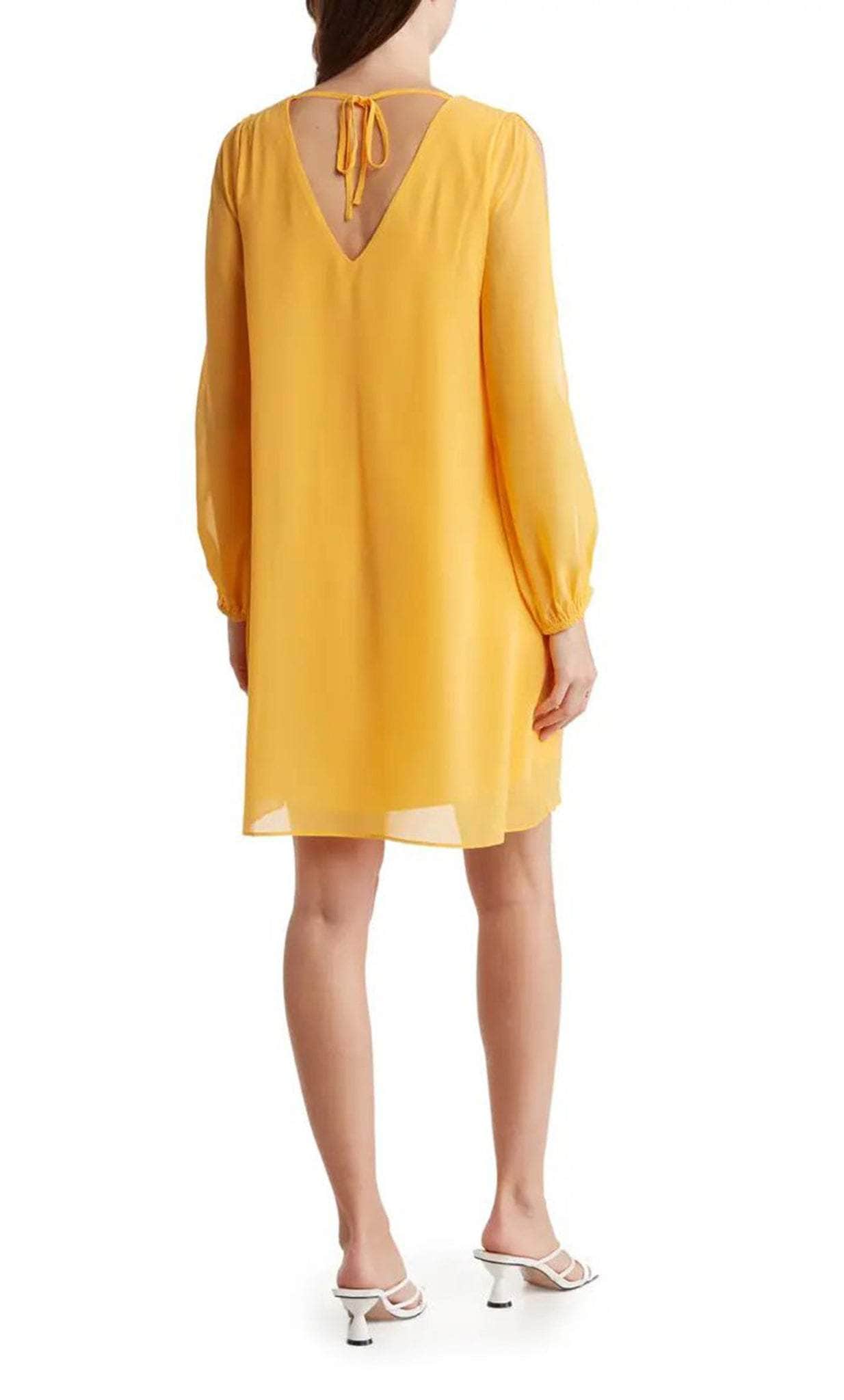 Details: Split Bishop Sleeves, Tie Back, V-Open Back, Short Hem