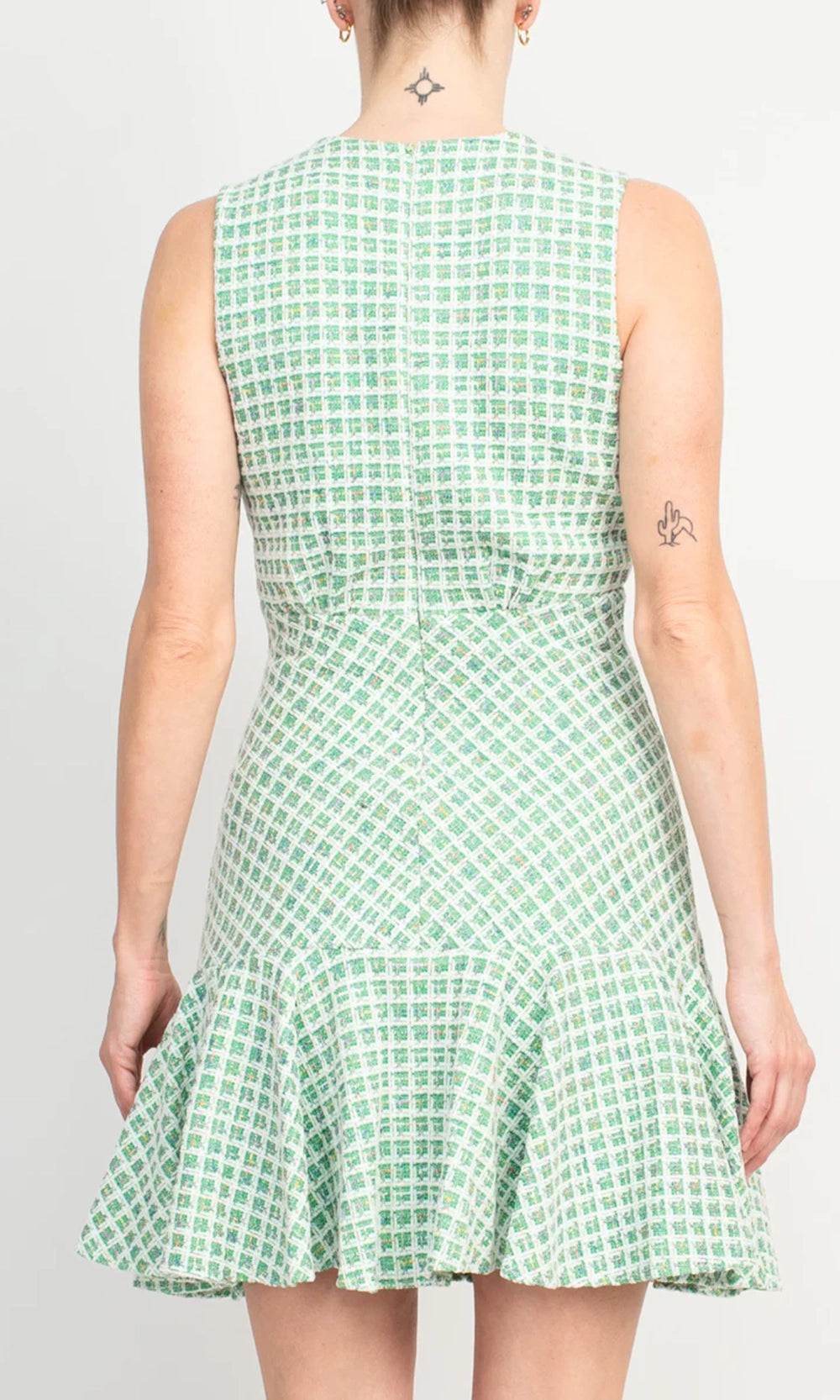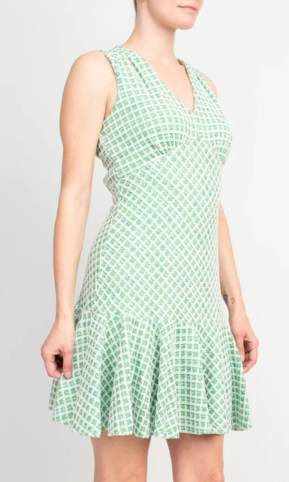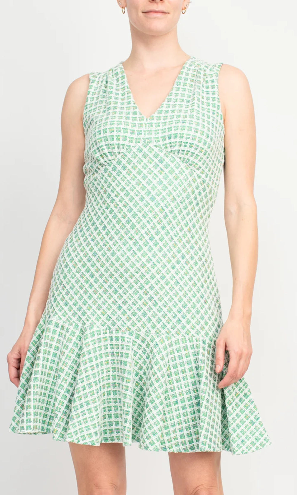 Brighten up your wardrobe with Taylor 3856M, a playful A-line dress made for easy elegance. Featuring a checkered pattern, the sleeveless design is balanced by a flattering V-neckline and fitted bodice that enhances your empire waist. A flounce hem adds lively motion, creating an effortless flow with every step. The lightweight boucle construction makes this short style a go-to choice for daywear that feels both refined and relaxed. Choose Taylor 3856M for a fresh and stylish take on comfort-driven fashion. Model is wearing Lime Green Multi color.