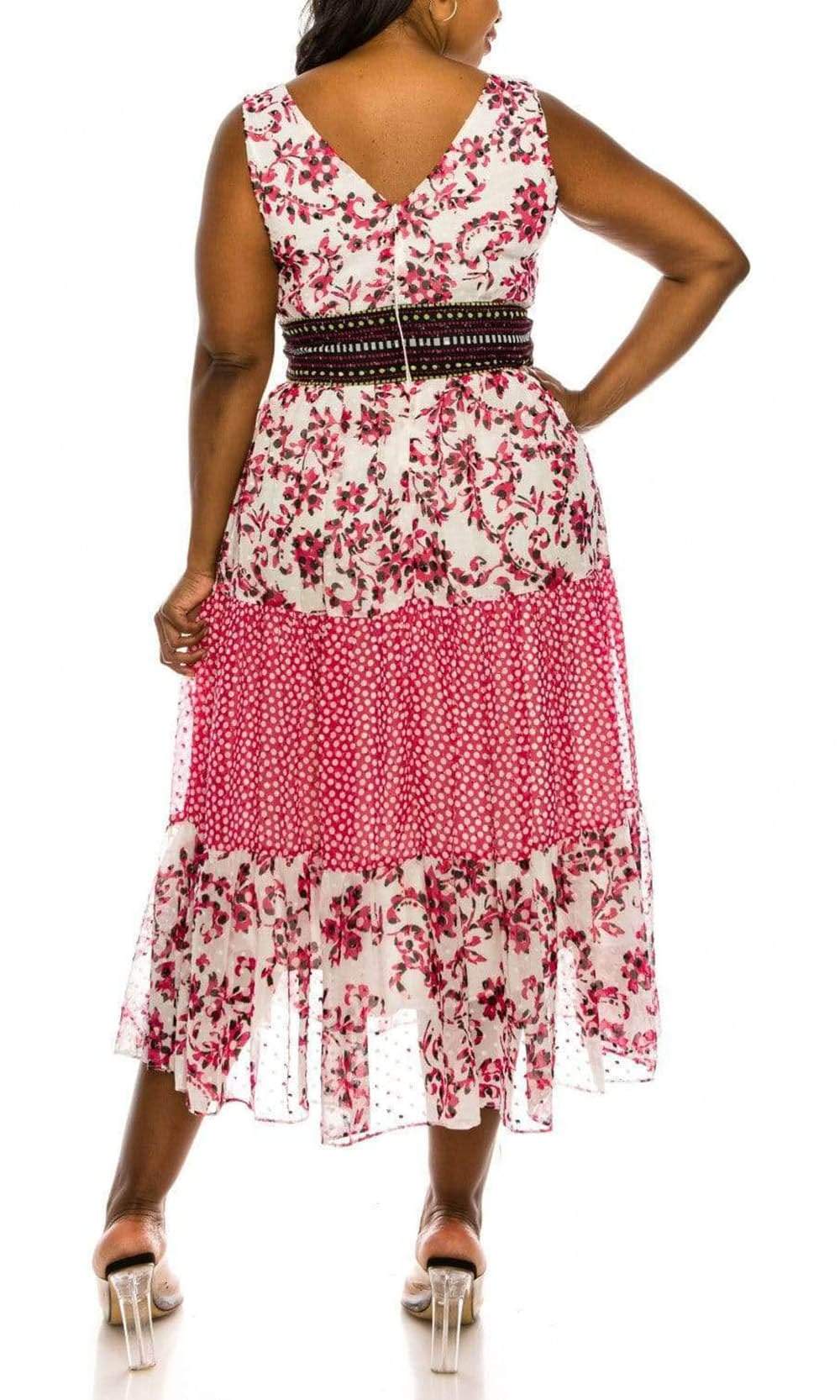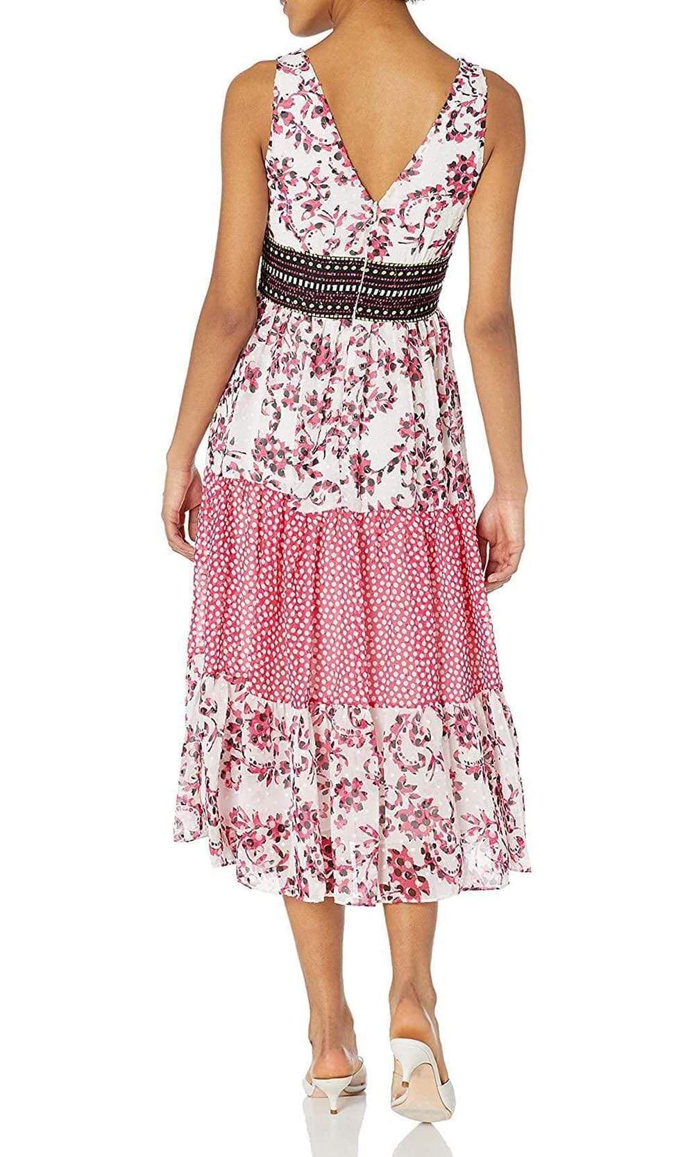 Revel in the vintage bohemian appeal of this Taylor 9713M creation. Designed with a floral chiffon silhouette, this beauty shows a v-neckline with ruffled trims that starts at the cap sleeves and meets on the bodice. The back has a v-open design and a Swiss dotted waistband. The tea length skirt flutters into an airy A-line silhouette. Impress everyone with the gorgeous style of this Taylor masterpiece.