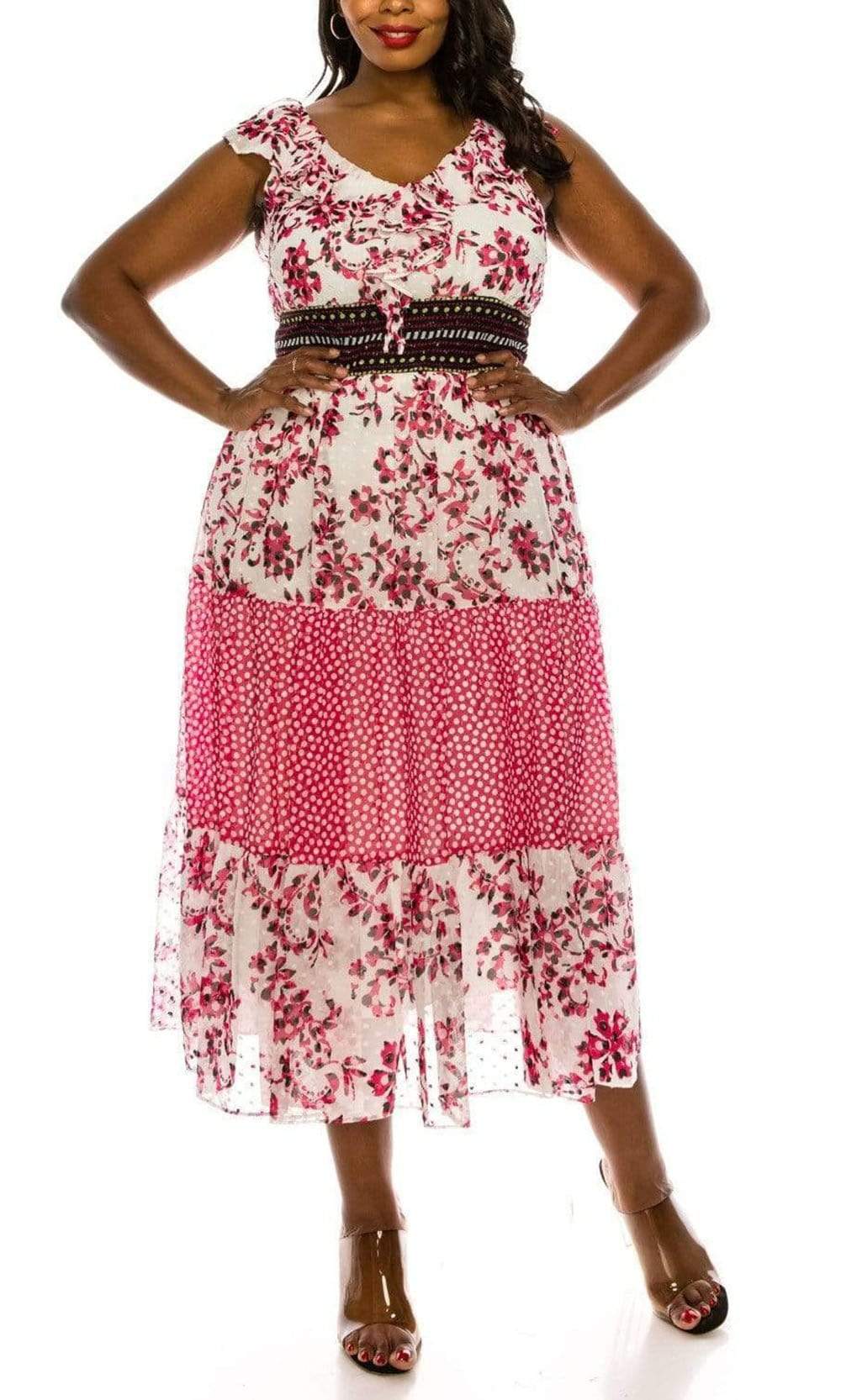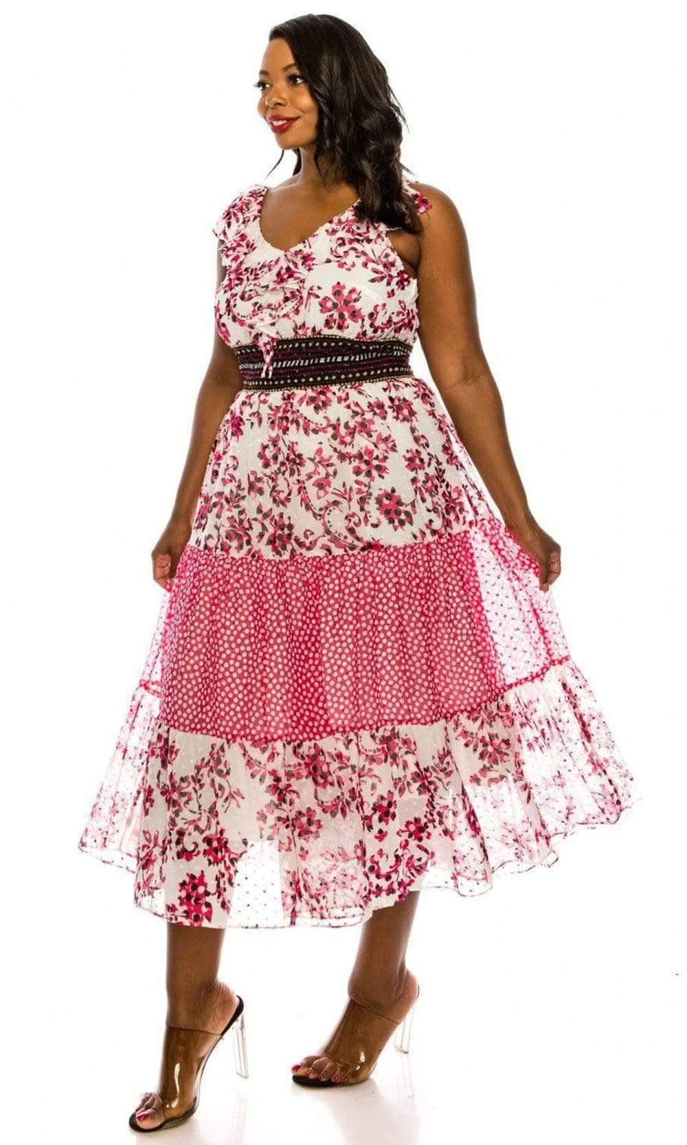| Details: | Cap Sleeves, Ruffle Trims, Swiss Dot Waistband, V-Open Back, Back Zipper Closure, Tea Length Hem |