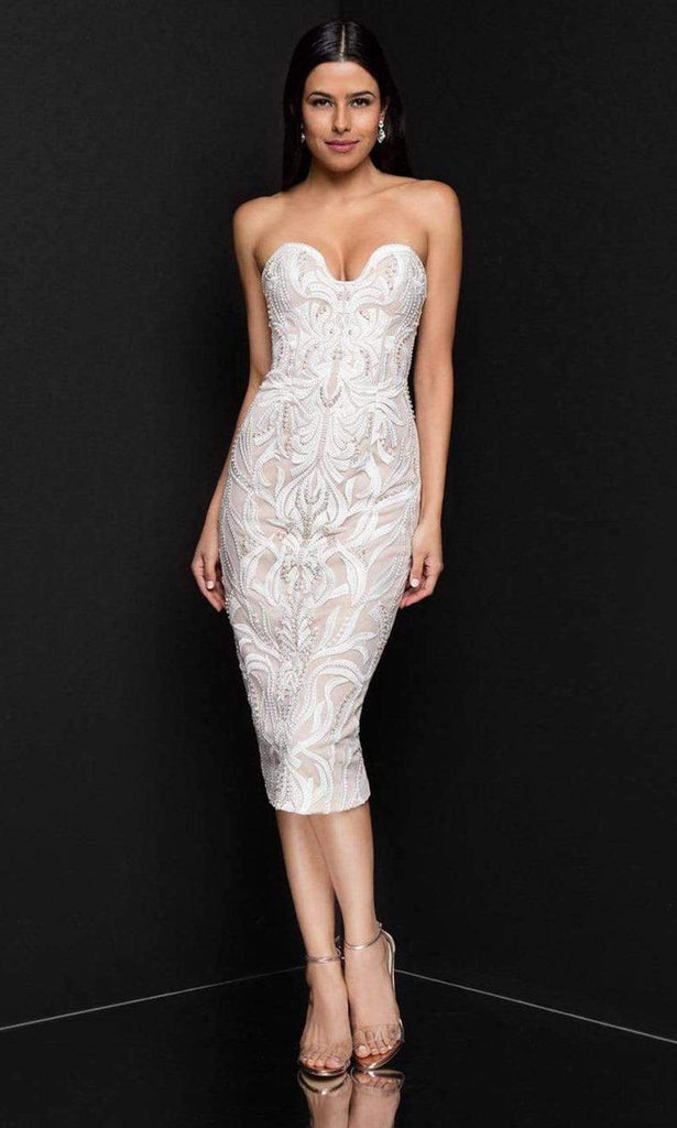 Gift yourself with beauty in this slinky tea length dress from Terani Couture 1811C6027. This elegant stunner features a strapless and fitted bodice with a modified sweetheart neckline. Appliques of highly-chosen beads embellished the entire dress creating an edgy look. This curve hugging dress flows to a tea length hemline with a mid-open back. Go beyond beautiful in a precious gown from Terani Couture design.