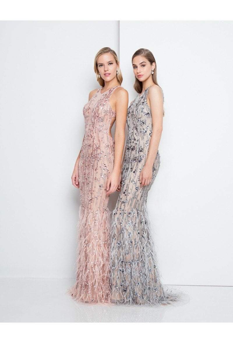 Turn yourself into a head-turning sensation by slipping into this utterly fetching Terani Couture 1811GL6454. The dress is designed with a sleeveless, illusion jewel neckline richly festooned with embellishments and feather accents. The dress has an open back and a slim fitting skirt with sweep train. Sparkle in beauty wearing this Terani Couture.