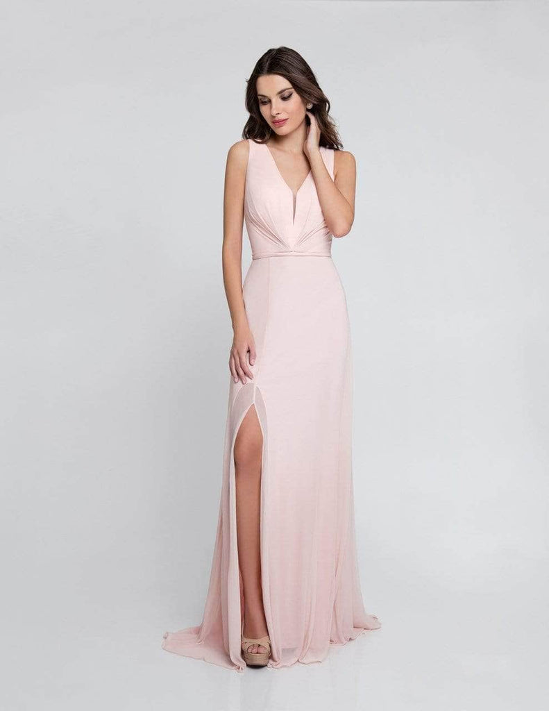 Gathered with pleats along the fitted bodice as it frames the low v-neckline, this impeccable piece shows a plunge notch with a shrouding illusion inset. Detailed with a v-cut open back and a slender band hugging the waist, the A-line skirt parts with a high slit for that daring feel before dipping down to the floor and completing with a trailing train. Model is wearing Blush, Lilac, Light Blue and Red colors.