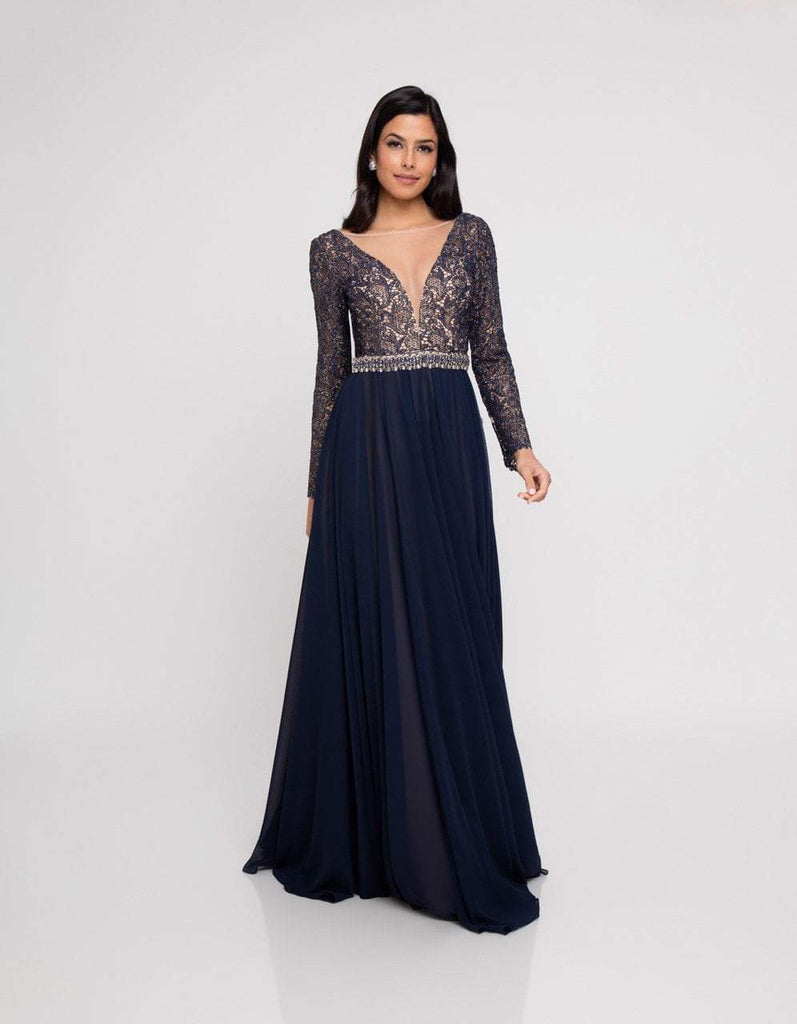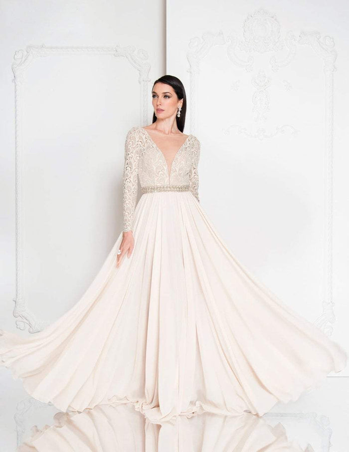 You will be an enchanting beauty in this evening gown by Terani Couture 1812M6650. The magnificent bodice has a seductive illusion bateau neckline with sheer plunge detail and long sleeves for a tantalizing and magical style. The waistline is embellished with shimmering beads while the back has a low scooped shape to show off your alluring skin. The A-line skirt is shirred with layers of material for a queenly look down to a full-length curling hemline at your feet. Glamorous and divine, this dreamy creation from Terani Couture is a beautiful choice for any black tie occasion. Model is wearing a Light Champagne color.