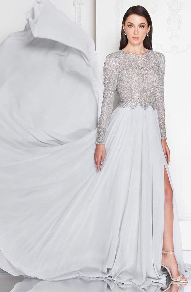 Make it an enchanted night in this magnifique evening gown by Terani 1813M6703. Exquisite crystal-clad fashions long, slim sleeves and a jewel neckline. Sparkling appliques trace a shirttail edge along the hips. A close fit defines an iconic silhouette while gossamer gathers shape the full-length skirt. Sheer and solid layers pool to fluid waves around the feet. Chic and refined, this dazzling Terani masterpiece is a stunning selection for your next black tie affair. Model is wearing Antique Silver color.