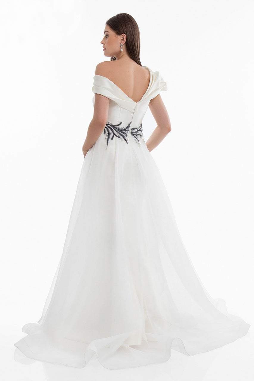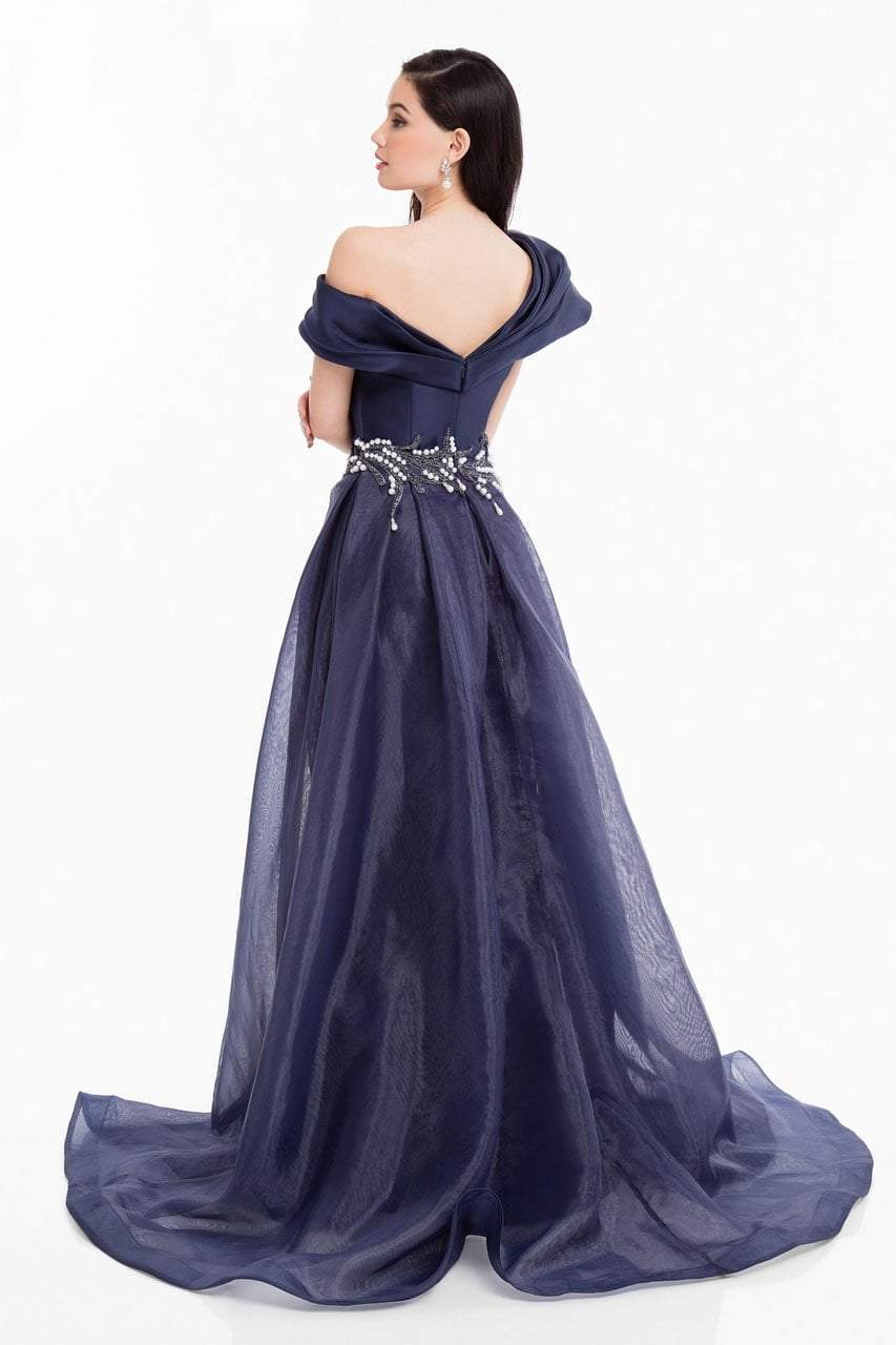 Resonate a sophisticated style that would rival that of the stunning celebrities in this Terani Couture 1821E7100 creation. Sleekly gathered into a dramatic panel to create a theatrical off shoulder neckline, this beauty showcases a slender bodice trimmed with sculpting seams and a complementary asymmetrical v-cut back. Beautifully embellished with a marriage of pearls and beads framing the sheer pleated overskirt, the mermaid skirt boasts of a showcase of the legs with its high slit and a stunning froth of sweep skirt. Have the crowd long for your alluring presence in this Terani Couture masterpiece.