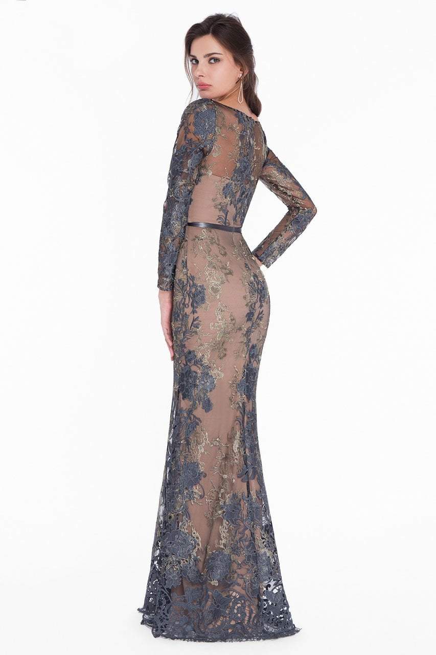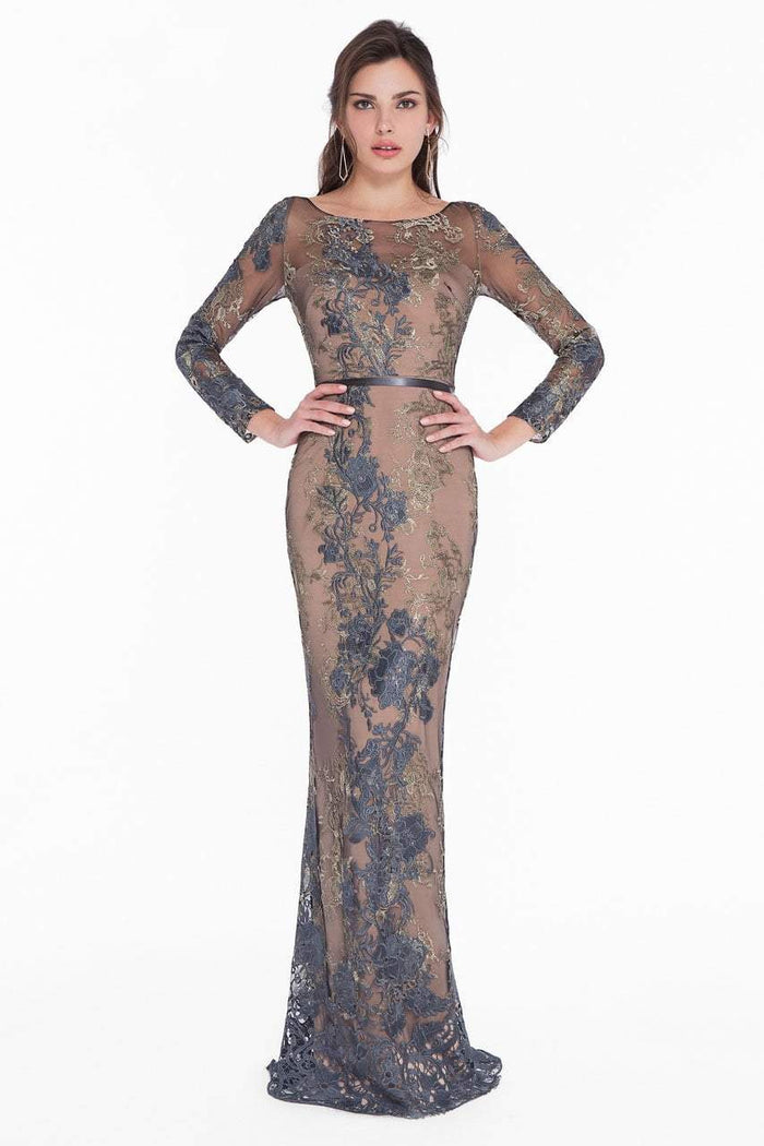 Exude elegance in this long formal dress by Terani Couture 1822E7292. Glams in an illusion bateau neckline with long sleeves. The dress is designed with metallic lace embroidery. The waist is cinched in a thin belt and flourishes a full-length sheath skirt with a scalloped hemline. Dress to the nines in this glam look by Terani Couture 1822E7292. Model is wearing the Gunmetal Gold color.