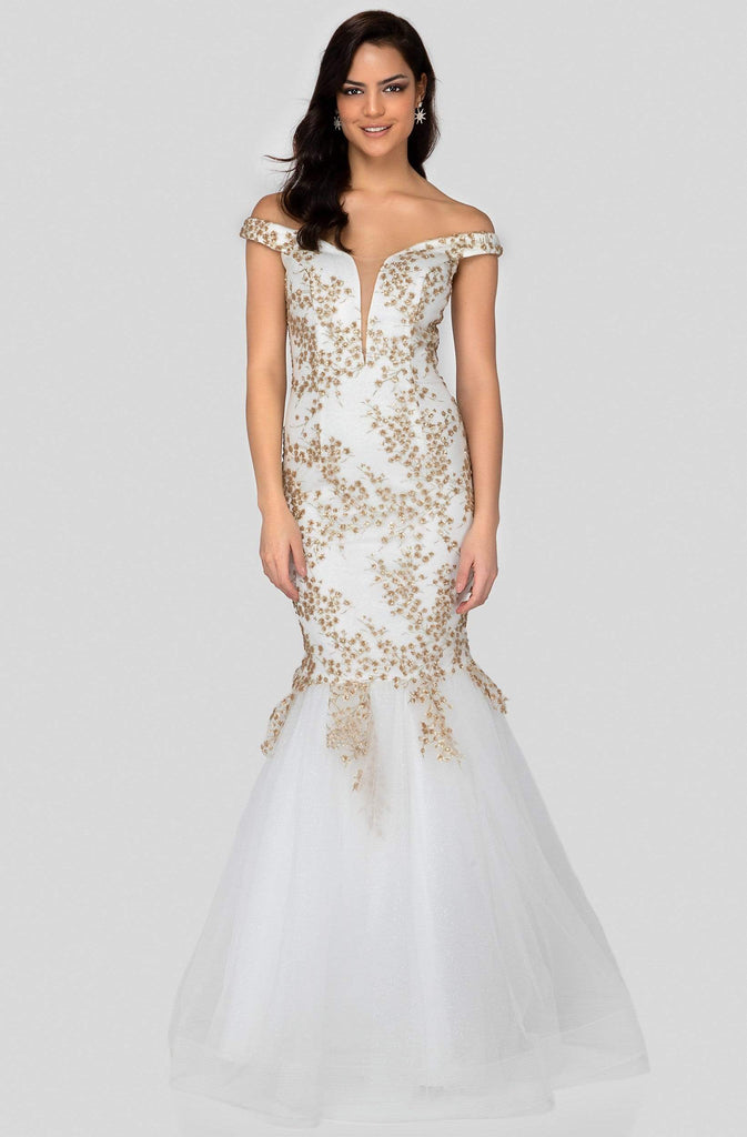 Wrap up in this winning style for evening by Terani Couture 1911P8646. An off shoulder neckline with sheer inset detail at the bust frames the fitted bodice complemented with a mid-open back. Golden 3D vine embellishments scattered allover the top cascading down the drop waist. The voluminous mermaid skirt flares with a floor-length fancy fishtail hemline. Turn heads instantly when you wear this Terani Couture ensemble. Model is wearing Ivory Gold color.