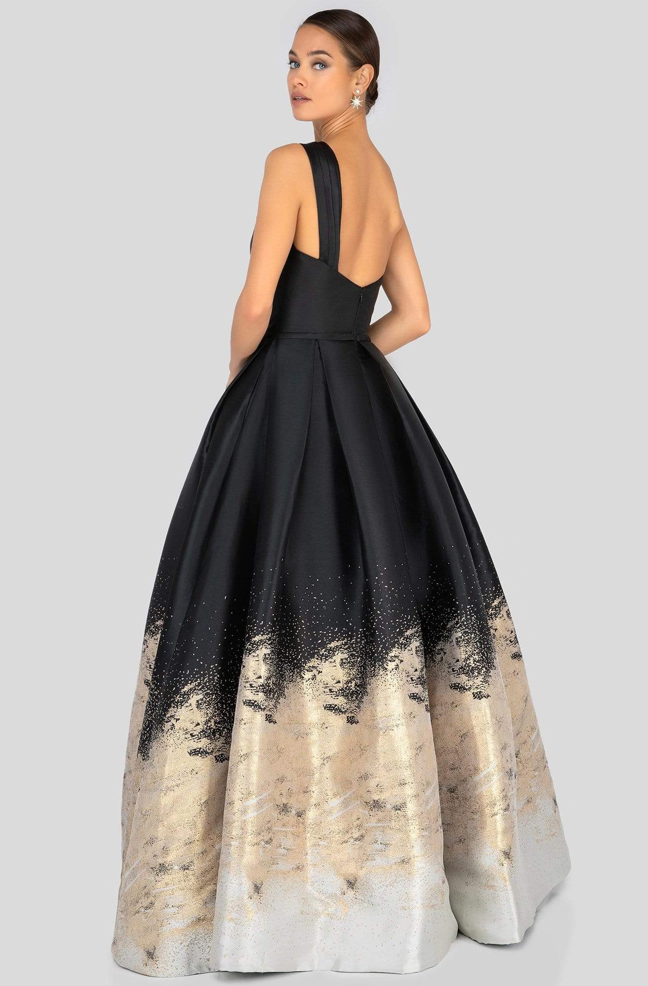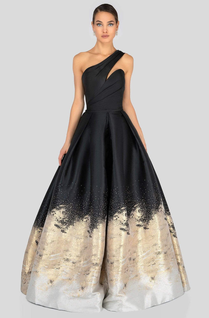 Mesmerize the crowd when you wear this gown from Terani Couture 1912E9180. This two tone gown showcases a sleeveless, asymmetric neckline with fitted bodice cinched in a thin band. The skirt opens in a pleated ballgown silhouette. Be the ultimate belle of the party in this gorgeous look from Terani Couture.
