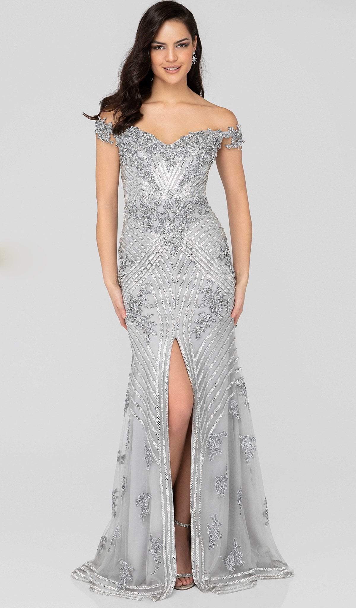 Exude that sparkling personality in this stunning dress by Terani Couture 1912GL9572. This off-the-shoulder glittering dress is lavishly wrapped in an overlay fitted bodice, embellished with beaded lace applique and similar shimmering details through the skirt. This figure flattering ensemble, skims the hips and ends with a ravishing finish at floor length complete with a thigh high front slit. This Terani Couture style is the perfect special event outfit for the girl who wants to stand out from the crowd while looking glamorous. Model is wearing Silver color. Find more prom dresses!
