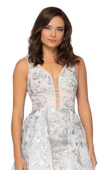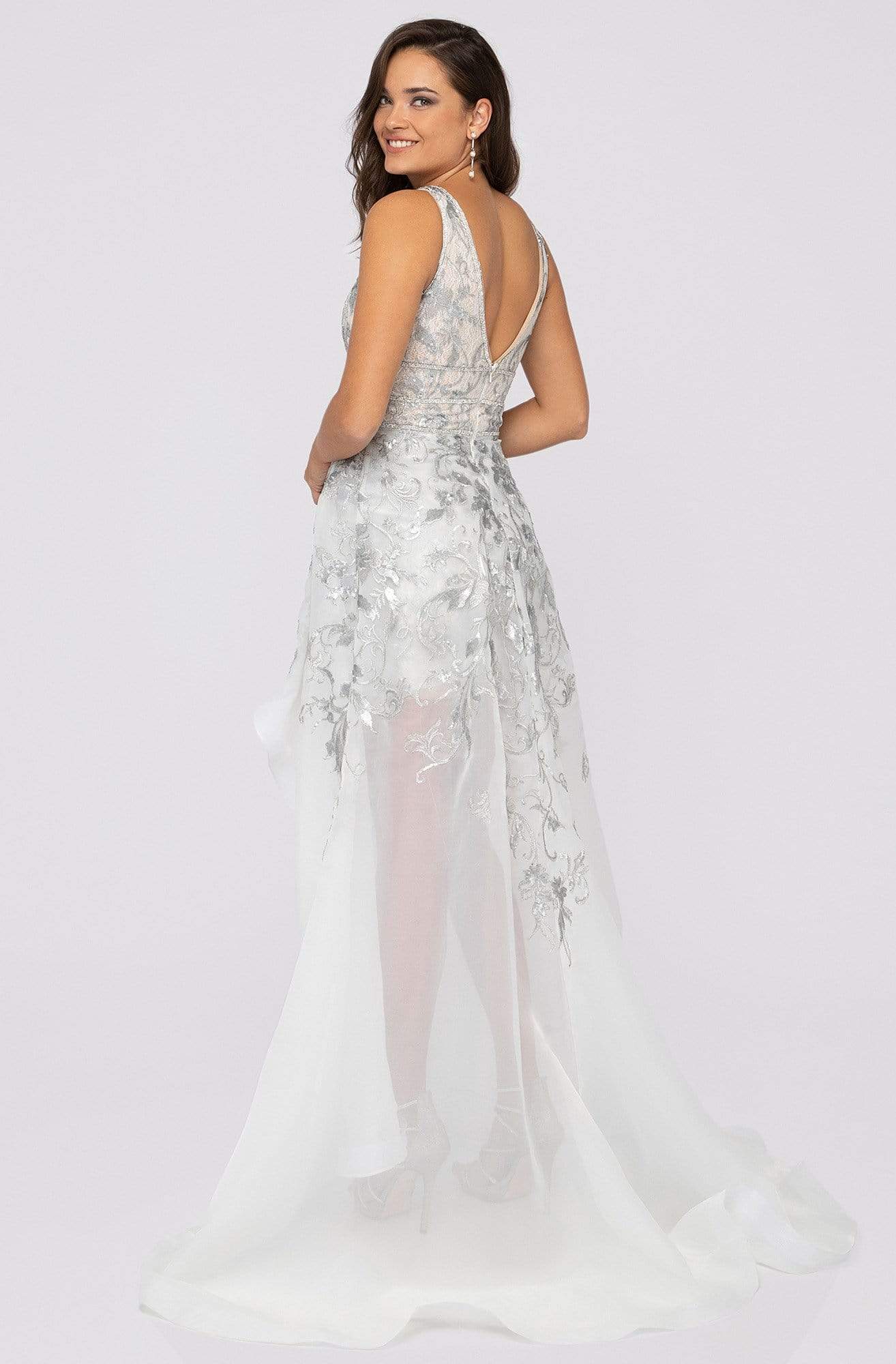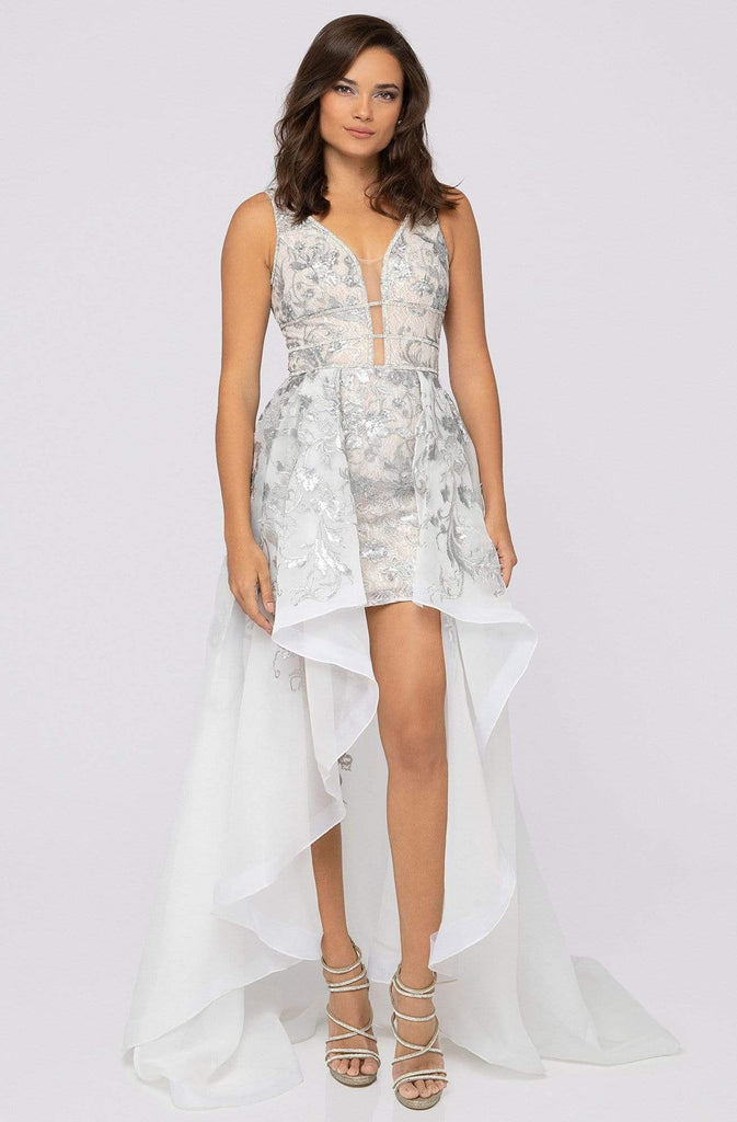Go for a timeless and sophisticated look wearing this prominent dress by Terani Couture 1913P8312. Fashions a sleeveless, deep V-neckline with sheer inset at mid-bust. The waist is wrapped in triple embellished bands while the A-line skirt runs in a high low hemline. This floral applique dress has a V-back and zipper closure while the skirt finishes in a sweep train. This Terani Couture dress is your excellent choice for prom or for any special occasion when you dare to look extraordinarily fabulous!