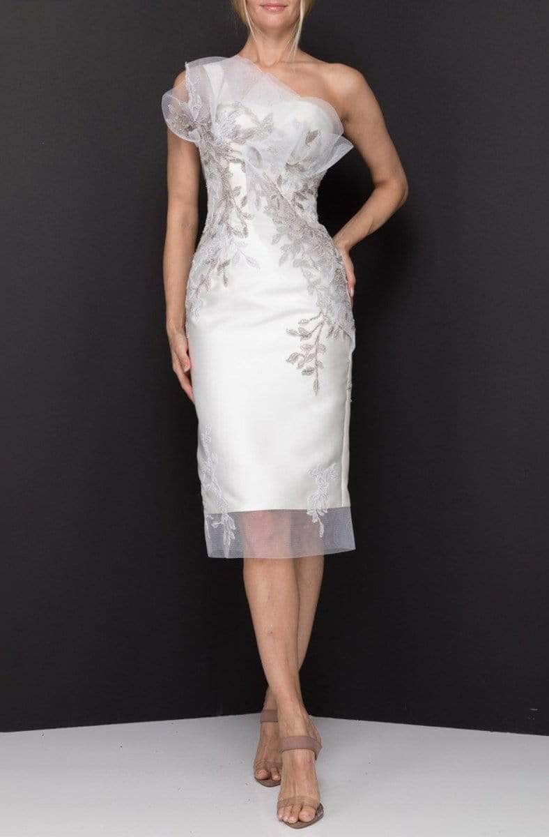 Showcase a fashion sense that flourishes beauty in this Terani Couture 2011C2003 dress. Crafted with sheer ruffles accenting the neckline, this beauty charms with an asymmetrical neckline with a one shoulder strap and a sweetheart notch. Accentuated with trailing foliage with beadwork down its length, the sheath skirt skims into a knee length form with a sheer hemline. The night is yours in a spectacular creation from Terani Couture 2011C2003. Models are wearing the Champagne Blush, and Ivory Silver colors.