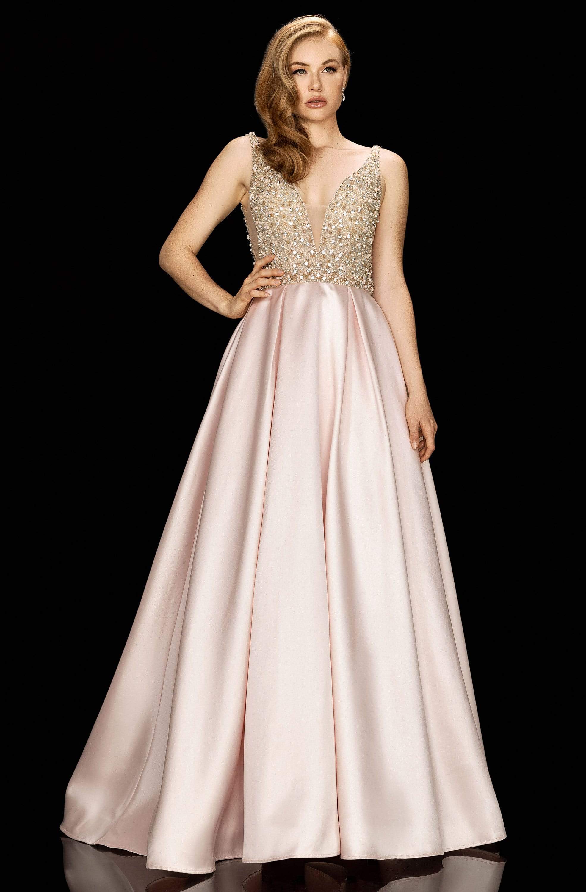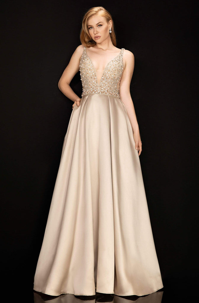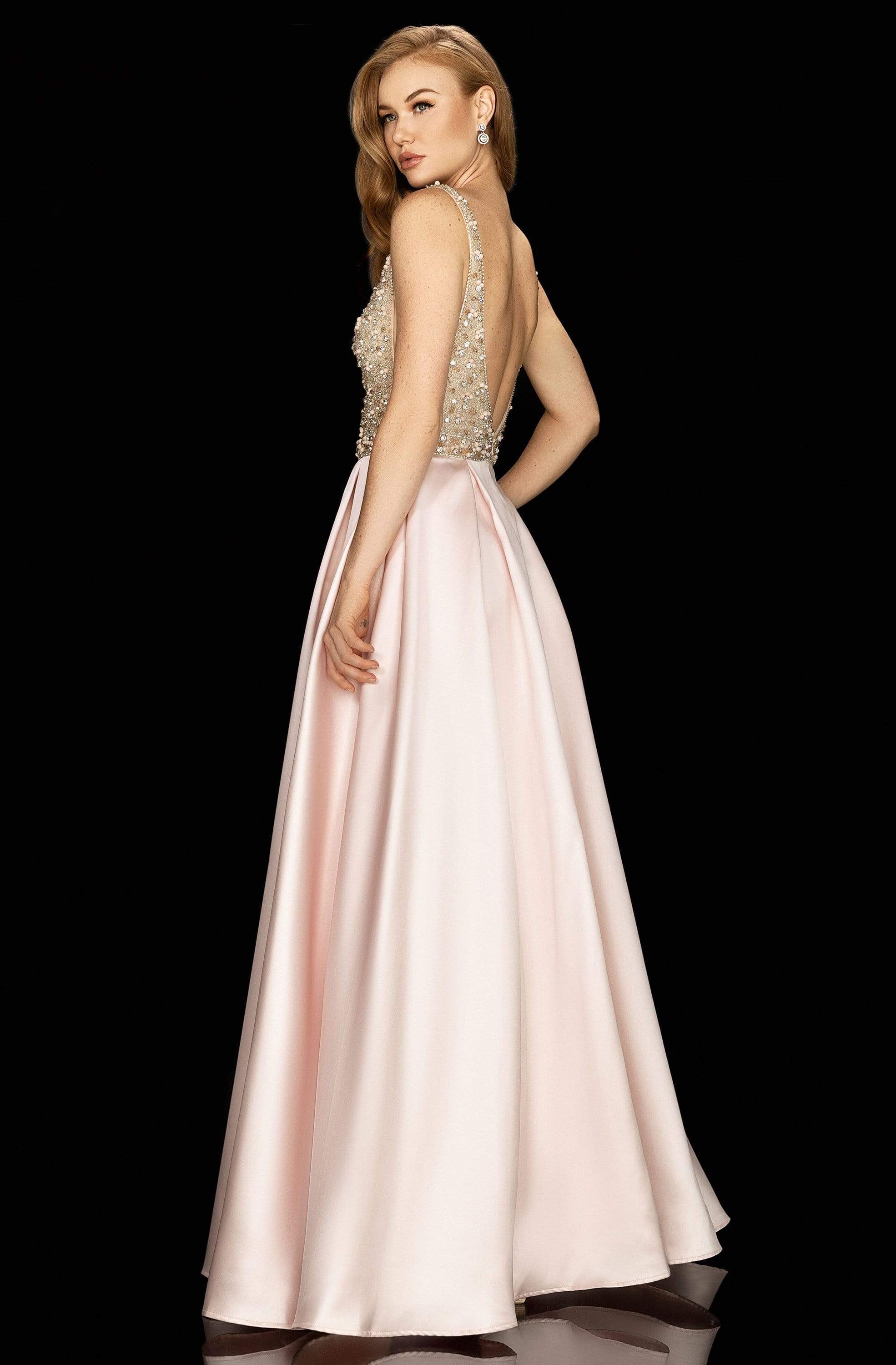 All eyes will be on you in this elegant evening gown by Terani Couture 2011P1094. This long gown features a sleeveless, deep V-neckline with sheer panels on its fitted bodice. The back flaunts a low V-back and from the waist flourishes a full length A-line skirt with pockets. Get the party started in this spectacular evening dress from Terani Couture.