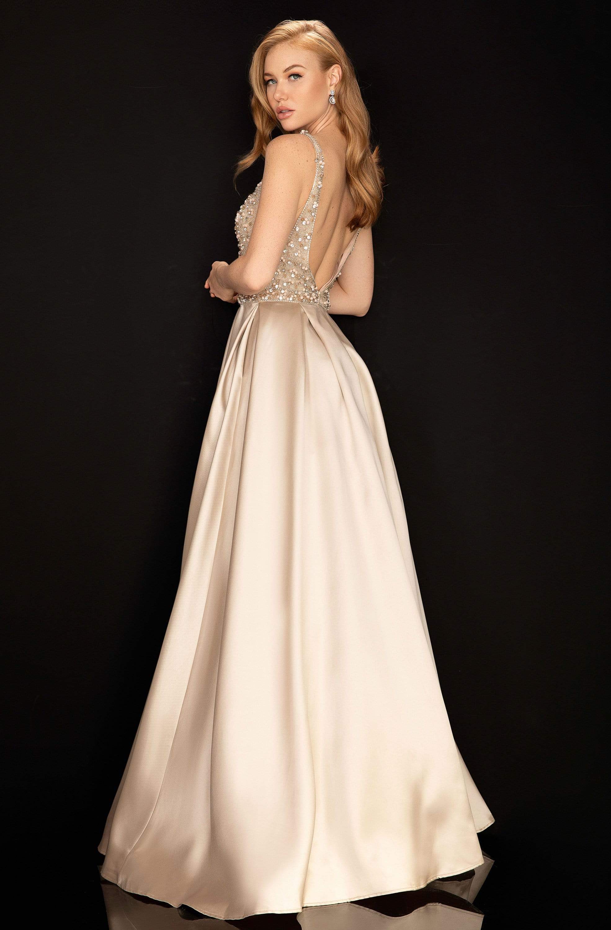 | Details: | Sleeveless, Plunging neckline, Sheer inset, Embellishments, Fitted bodice, A-line skirt, Low V-back, Pockets |