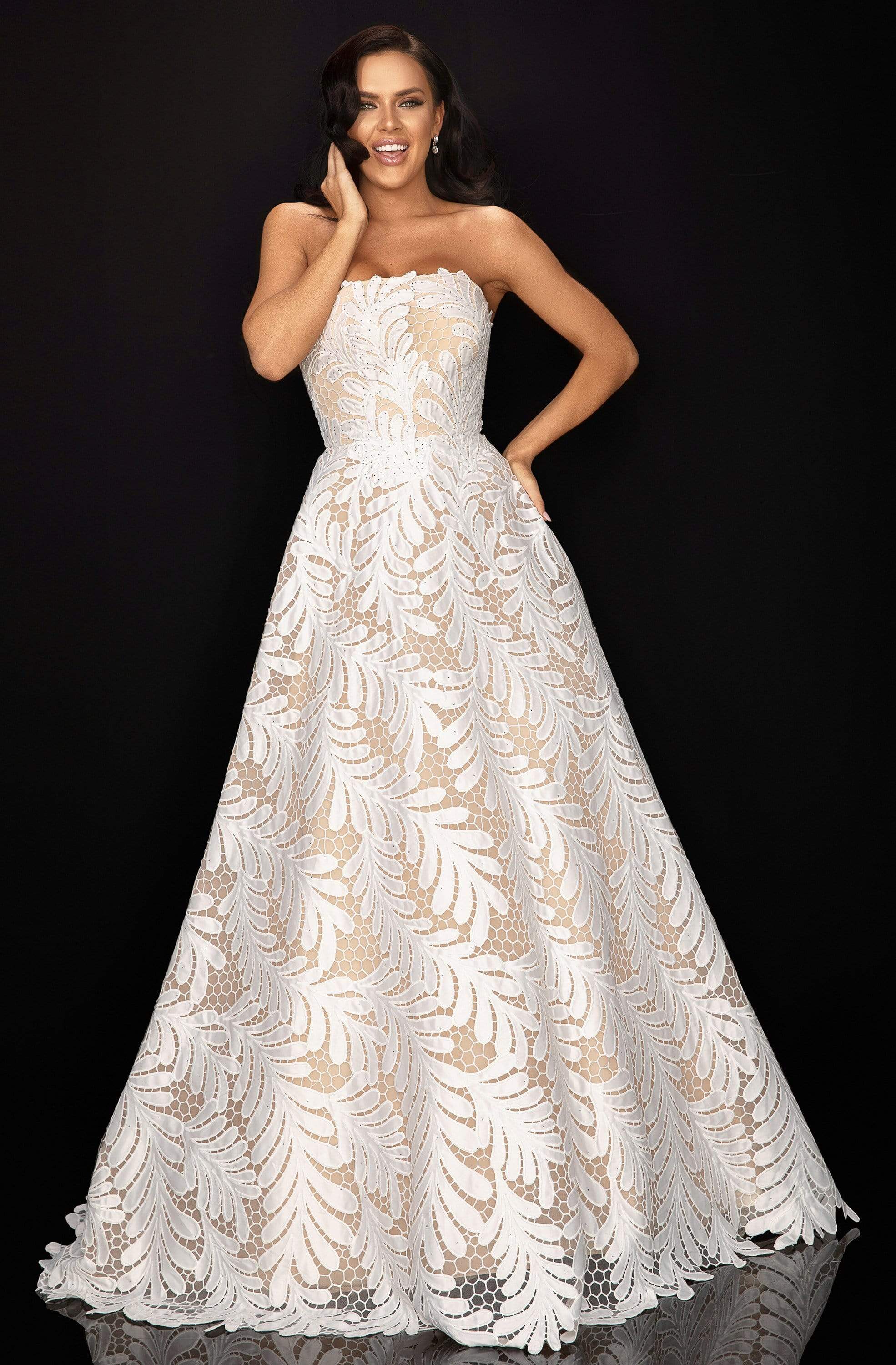 Be strikingly beautiful in this lovely Terani Couture 2011P1183 evening dress. A strapless straight across neckline crowns the fitted bodice, complemented with a straight mid-open back. The whole ensemble is designed in leaf-like over net fabric as the skirt parades a ballgown silhouette that falls to a full length hemline. Strike a pose as you enter the room in this exquisite Terani Couture piece. Model is wearing Ivory Nude color.