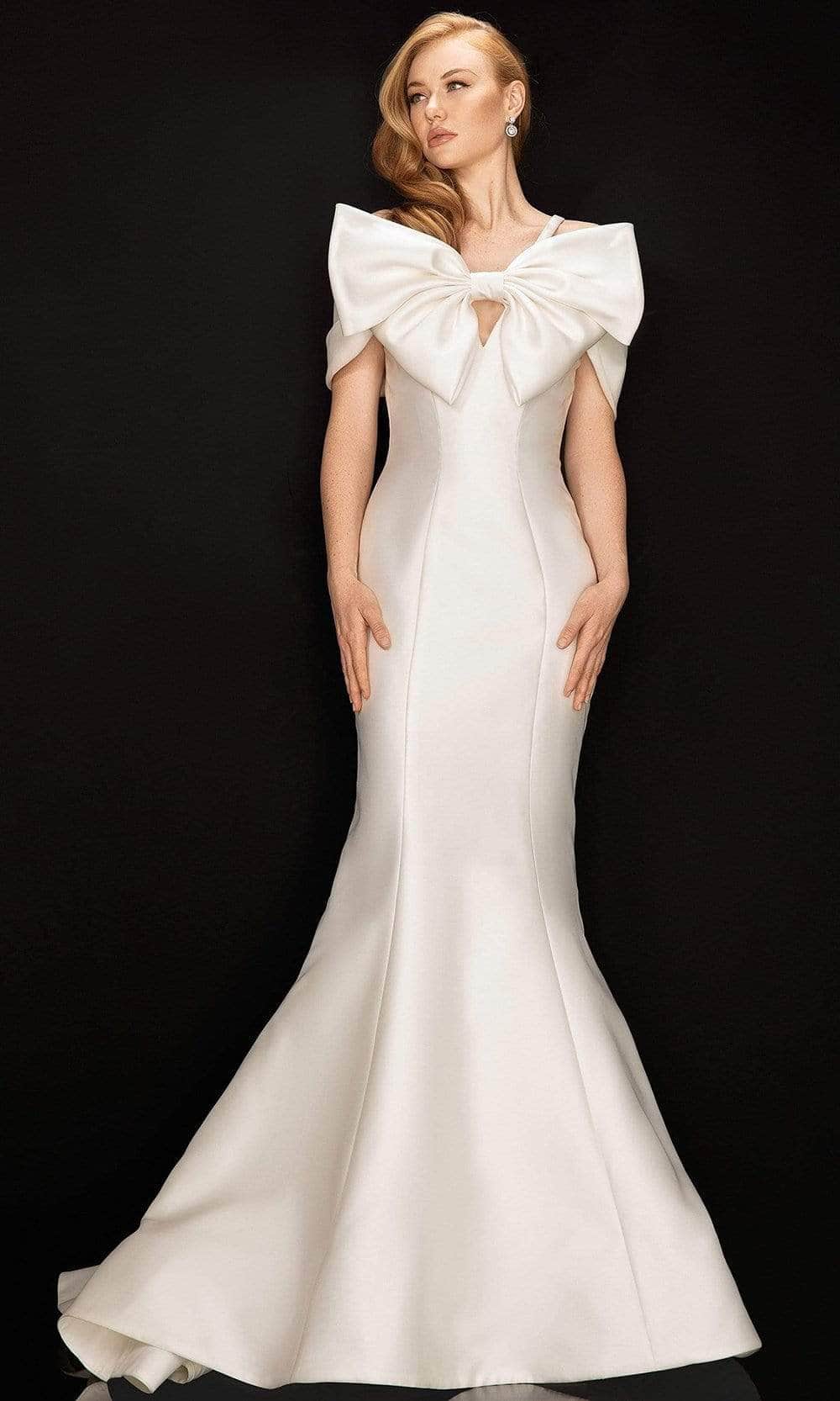 Be prepared to dazzle the crowd in this extraordinary dress from Terani Couture, 2012E2279, adorned with a captivating bow. This vibrant Mikado gown presents a V-neckline with a structured bow accent. The fitted bodice is supported with shoulder straps and wrap-around off-shoulder sleeves. The skirt fashions an elegant mermaid silhouette that fits at the thighs and flares at the bottom to a sweep train finish. Glisten and glamour as you don this sublime Terani Couture 2012E2279 masterpiece. Models are wearing the Crimson, Emerald, Ivory, and Royal colors.