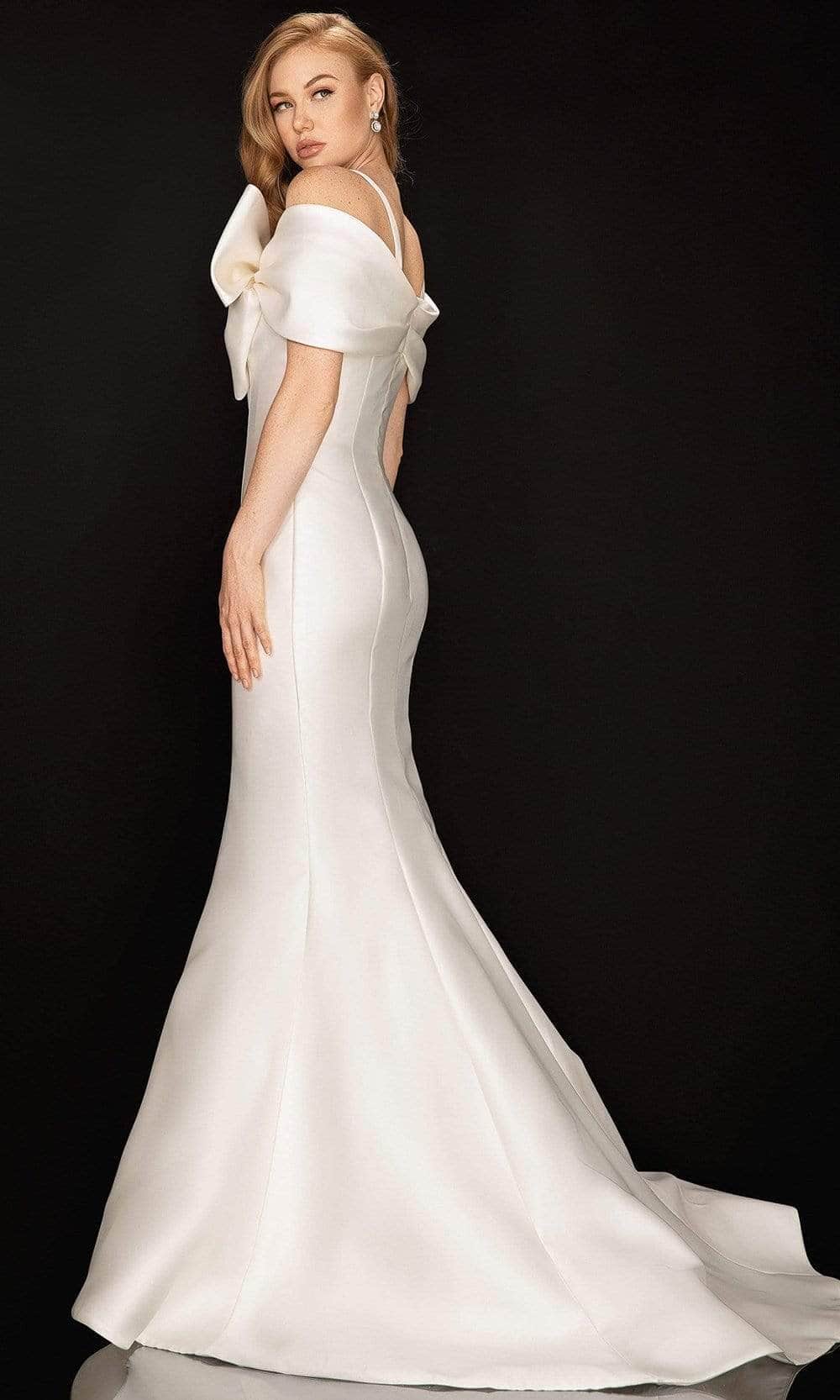 | Details: | Mikado Fabric, Huge bow accent, Off-shoulder sleeves, Fitted bodice, Visible seams, Mermaid skirt, Straps, Sweep train |