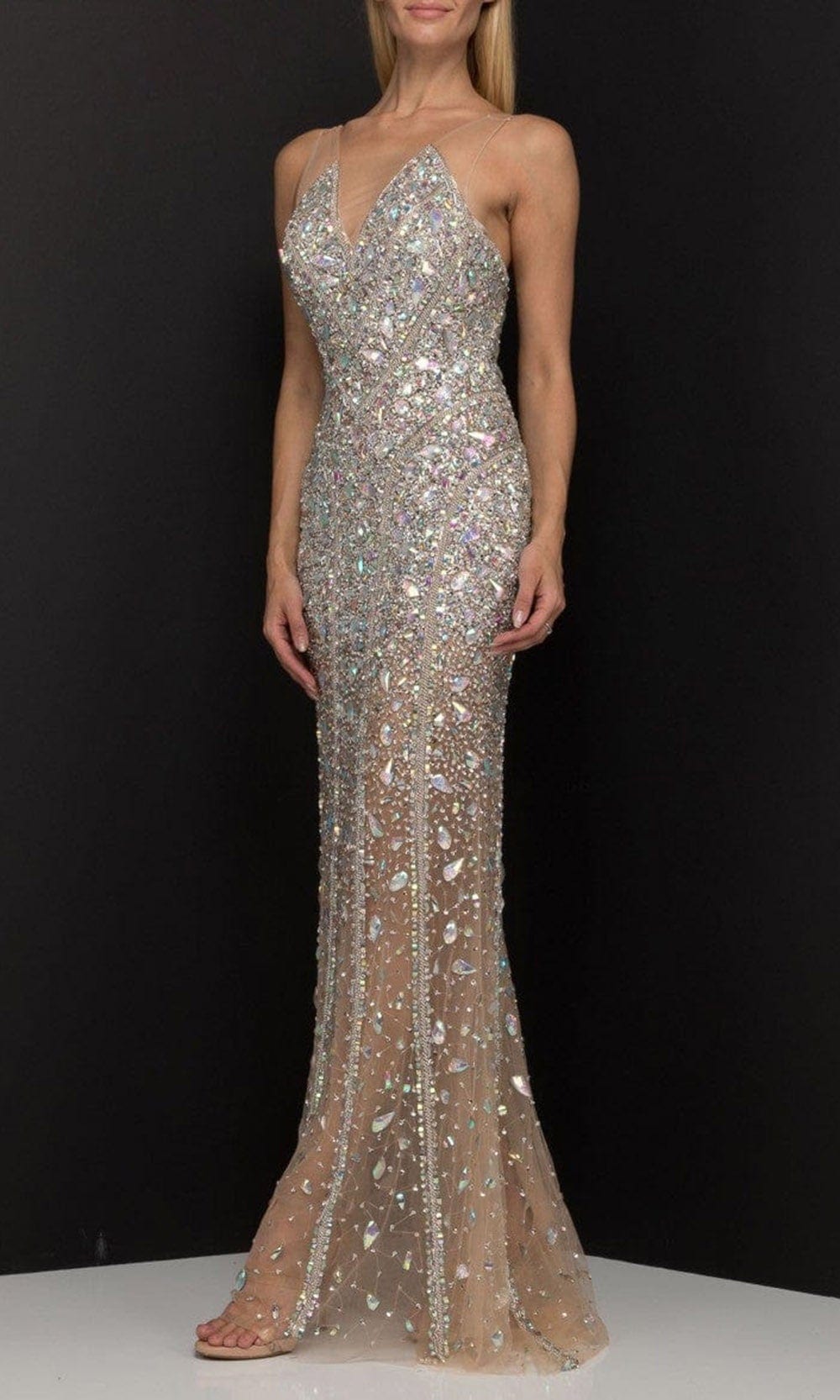 | Details: | Beaded, Sleeveless, Illusion Straps, Low V-Open Back, Zipper Closure, Sweep Train |