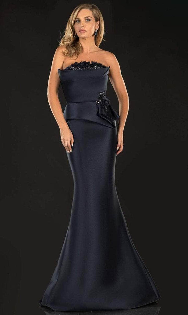 Fashions a strapless neckline with floral appliques. It has a flattering fitted bodice with a peplum detail. The mermaid skirt is styled with princess seams and finishes in a sweep train for added drama. Model is wearing Navy color.